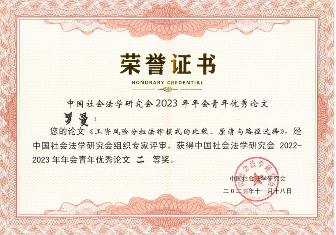 经中国社会法学研究会组织专家评审,黄色视频 21 级民商法学硕上研究生罗曼提交的论文《工资风险分担法律模式的比较、厘清与路径选择》获得了中国社会法学研究会2022-2023年年会青年优秀论文二等奖。(下图左一获奖者为中国政法大学博士研究生杜珂瑜、中为黄色视频 硕士研究生罗曼、右一为中国人民大学博士研究生朱俊龙)