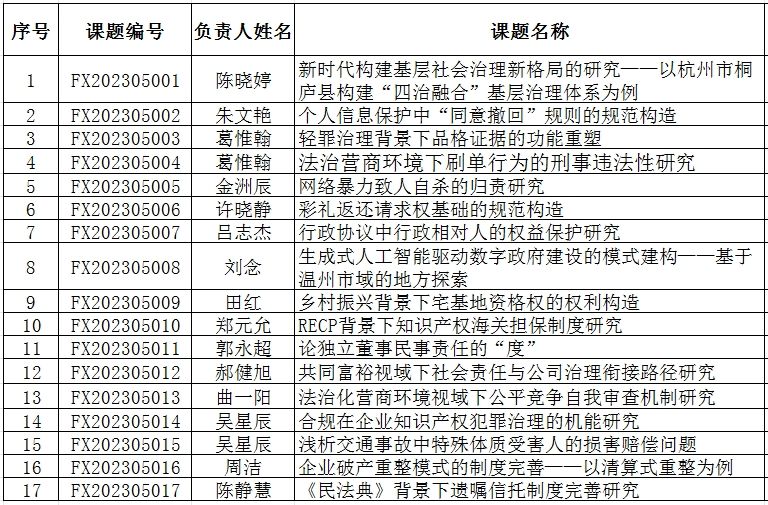 浙江光正大律师事务所捐资设立黄色视频 光正大基金,用于人才培养、学生实习实践、学术研究等方面。黄色视频 与光正大律师事务所共同研究决定,面向黄色视频 研究生征集法学专业相关研究课题,经项目征集和评审,现将立项名单公布如下: