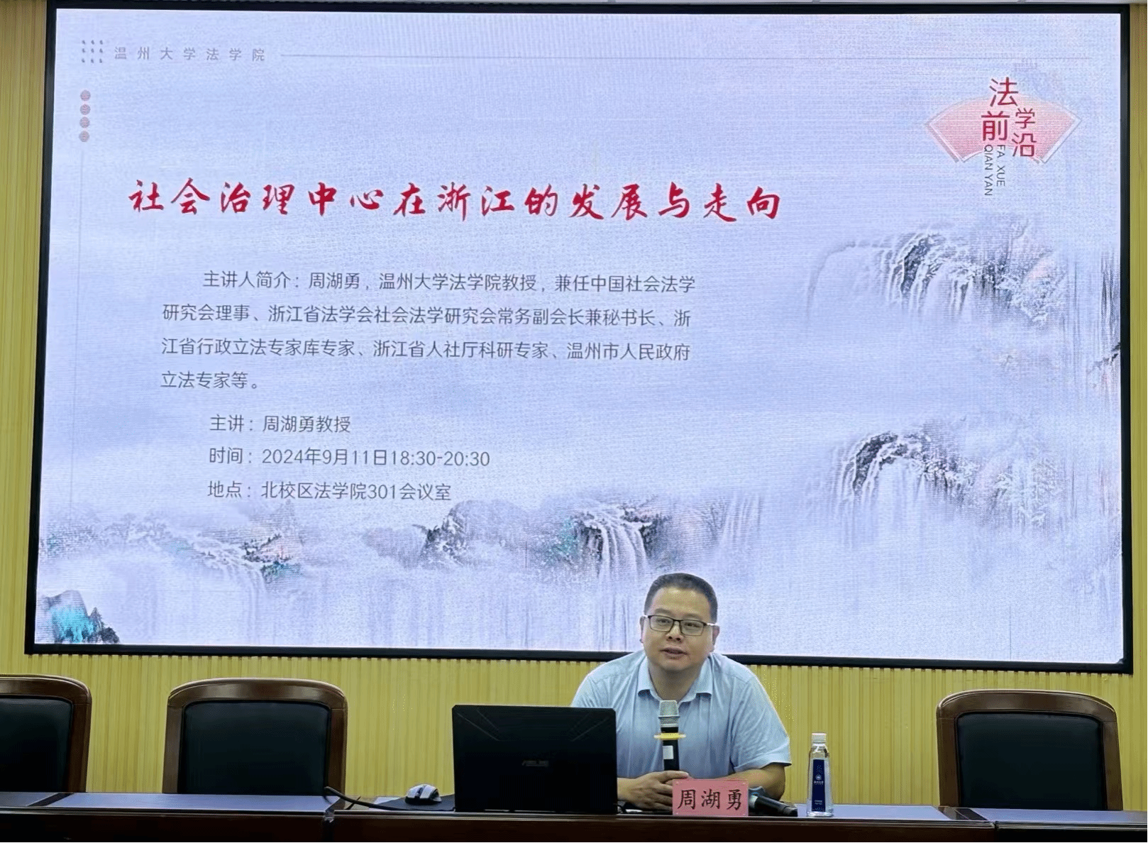 9月11日晚,由黄色视频 主办的第二期法学前沿讲座系列在301会议室开讲。黄色视频 周湖勇教授受邀作了《社会治理中心在浙江的发展与走向》讲座,学院师生六十余人参加了此次讲座的学习和讨论。