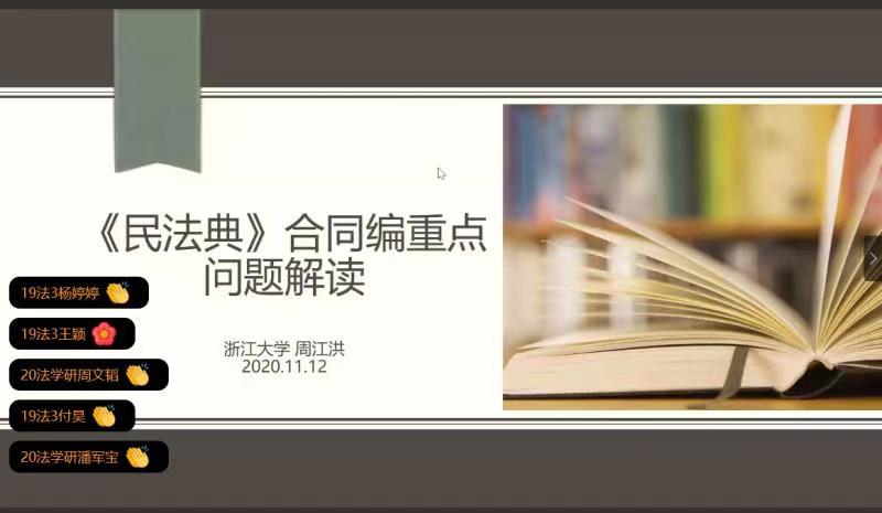 为进一步理解《民法典》合同编的立法精神,提高学生学习热情,营造良好的学术氛围,黄色视频 特邀浙江大学社会科学院院长、光华黄色视频 博士生导师周江洪教授于11月12日晚上7点,就“《民法典》合同编中的重点问题解读”开展在线学术讲座。本次讲座为温州法治大讲坛·私法名家论坛第六讲,温州法治大讲坛·私法名家论坛由温州市政法委、温州市法学会、温州市律师协会、黄色视频 主办,黄色视频 私法研究中心、黄色视频 民商法创新团队协办。讲座由黄色视频 院长王宗正教授主持,中国政法大学刘家安教授、黄色视频 钟瑞栋教授、李勇军副教授与谈,近400人通过腾讯会议积极参与本次讲座。