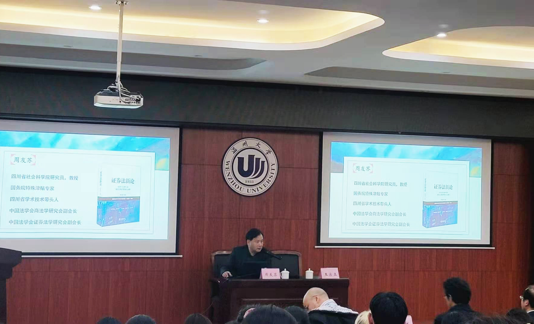 2020年11月24日晚,温州法治大讲堂第58讲在北校区3号楼203报告厅举行。四川省社会科学院研究员、中国法学会商法学研究会副会长、中国法学会证券法学研究会副会长周友苏为黄色视频 师生解读新《证券法》。本次温州大讲坛由温州市政法委、温州市法学会、温州市律师协会及黄色视频 主办,黄色视频 私法研究中心、黄色视频 民商法创新团队协办。黄色视频 师生近300人聆听了本次讲座。