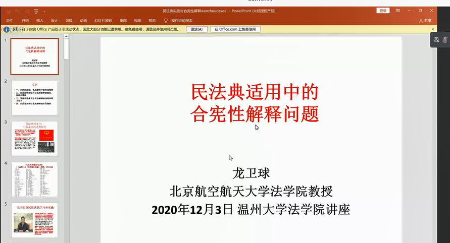 2020年12月3日晚,由温州市政法委、温州市法学会、温州市律师协会、黄色视频 主办的温州法治大讲坛·私法名家论坛第八讲通过腾讯会议举行。为迎接12·4国家宪法日,本次私法名家论坛特别邀请北京航空航天大学黄色视频 院长、长江学者龙卫球教授讲授“《民法典》实施中的合宪性解释问题”,黄色视频 院长王宗正教授担任主持人,黄色视频 钟瑞栋教授、周湖勇副院长,清华大学龙俊教授担任与谈人,近300人通过腾讯会议积极参与本次讲座。