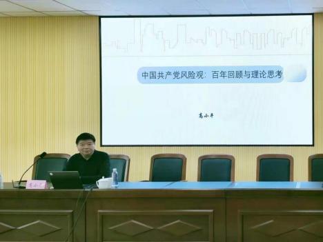 讲座中,高教授旁征博引,娓娓道来,围绕“风险与中国共产党风险观、党的风险历史观、党的风险现实观、党的风险制度观和中国共产党风险观与风险文化”五个方面进行了详细分析和讲解。高教授首先从风险二字谈起,阐释了风险的定义和风险观的内容,着重说明了党的风险观是人类风险认知的最新成果。接着分析了“中国共产党风险观的本质性特征、中国共产党风险观的现实性展示和中国共产党风险观的必然性发展”等内容。并结合丰富的实证资料和党的发展历程,详解党的风险观在形成、建立、发展三个阶段的核心思想和所面临的问题。接着就“党的风险制度观”进行了四个板块的分析:“‘党的领导’与‘政府主责’的制度理念、‘风险防范’与‘群众动员工作’相结合的制度理念、‘短期预警机制’和‘长期风险战略’相结合的制度理念和‘系统性风险防范体制机制’的制度理念”。最后,在谈及“中国共产党风险观与风险文化”时,高教授指出:面对风险,中国共产党始终以科学理论为指导正确判断形势、始终与群众工作相结合,发动群众依靠群众、善于从中总结经验、吸取教训并加强治理现代化和应急管理现代化。