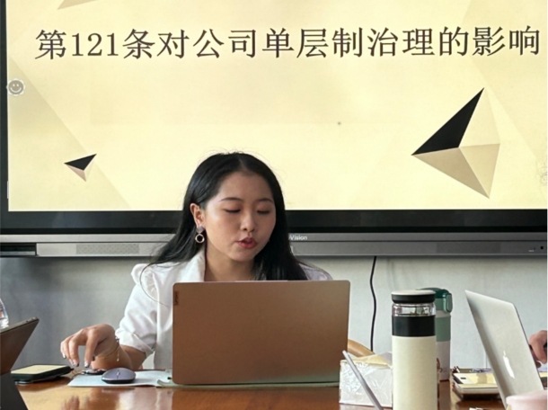 2022级硕士研究生邵欣然同学主要分享了《公司法(草案三次审议稿)》中第121条的变动对公司单层制治理的影响。她认为,三审稿扩大了审计委员会成员的身份,一定程度上避免董事身兼数职的情况出现;同时,三审稿也删除了对会计专业人士的要求,由审计委员会来全面地履行监事会的职责,但完全不要求其专业能力,合理性值得商榷。结合二审稿的规定和域外法,并在比较分析单层制和双层制的区别及审计委员会在公司治理中作用的基础上,认为第121条的变动整体上在往单层制的公司治理模式上靠拢,用审计委员会取代监事会,同时应拓宽审计委员会的职能,让审计委员会能够更全面地行使监事会的职权。