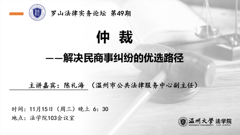11月15日晚, “罗山法律实务论坛”第49期在黄色视频 103会议室开讲。此次活动邀请的主讲嘉宾是温州市公共法律服务中心陈海礼副主任,他主讲的题目为《仲裁——解决民商事纠纷的优选路径》。本次活动由法学专业负责人、民商经济法系主任李勇军副教授主持。