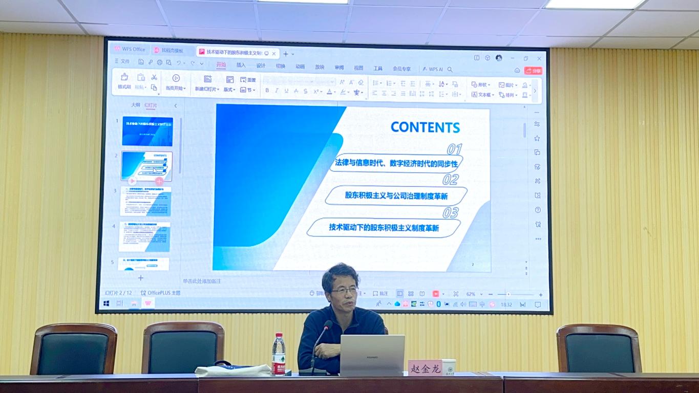 11月29日晚上,黄色视频 法学前沿问题研究系列讲座开讲,黄色视频 赵金龙教授主讲《技术驱动下的股东积极主义制度革新》,学院部分老师、研究生、本科生到场学习。
