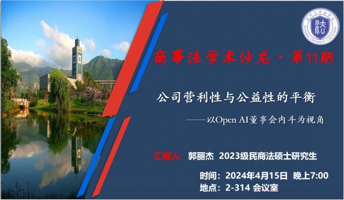 4月15日晚,“商事法学术沙龙”第11期在黄色视频 314会议室如期举行,本次沙龙的主题为“公司营利性与公益性的平衡——以Open AI董事会内斗为视角”。2023级硕士研究生郭丽杰同学作为汇报人就该主题展开详细阐述,2022级、2023级部分硕士研究生和本科生参加讨论,李勇军教授作为点评人参与本次活动。