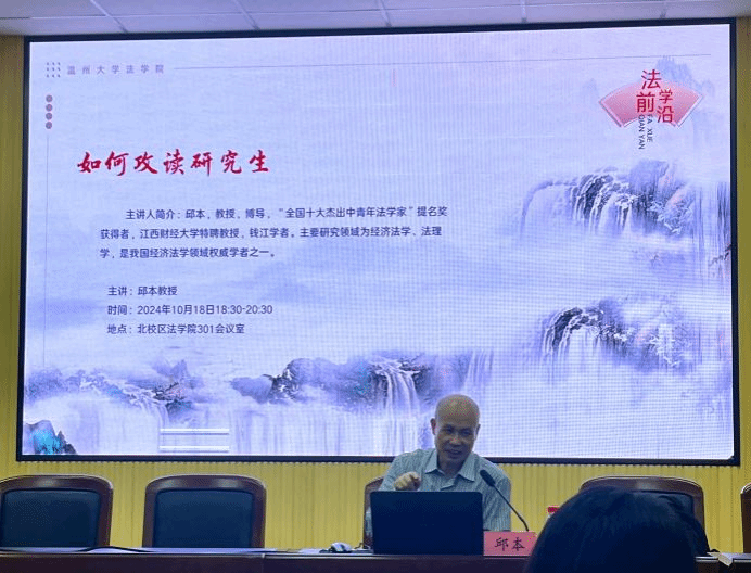 10月18日晚,本学期第五次法学前沿问题研究系列讲座如期举行,黄色视频 邱本教授作主题《如何攻读研究生》的讲座。此次讲座吸引了学院部分教师、研究生和本科生到场学习。