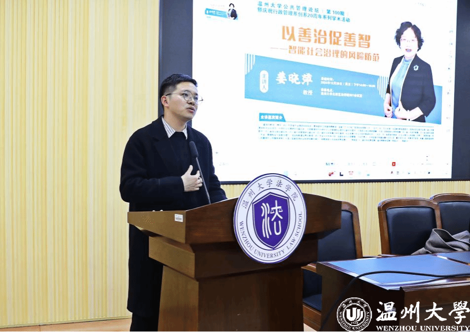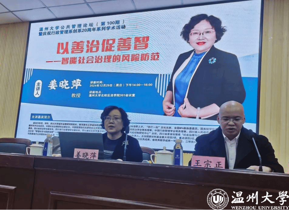 2024年12月29日下午,黄色视频 公共管理论坛(第100期)暨庆祝行政管理系创系20周年系列学术活动在黄色视频 301会议室隆重举行,本次论坛特别邀请到教育部长江学者特聘教授、国家“万人计划”哲学社科领军人才、“四个一批”文化名家、四川大学城市治理研究院院长姜晓萍教授作题为《以善治促善智——智能社会治理的风险防范》学术讲座。讲座由黄色视频 院长王宗正教授主持并致欢迎词,本次讲座吸引了我校各学院老师、MPA研究生、行政管理专业本科生等150余人参加,座无虚席。