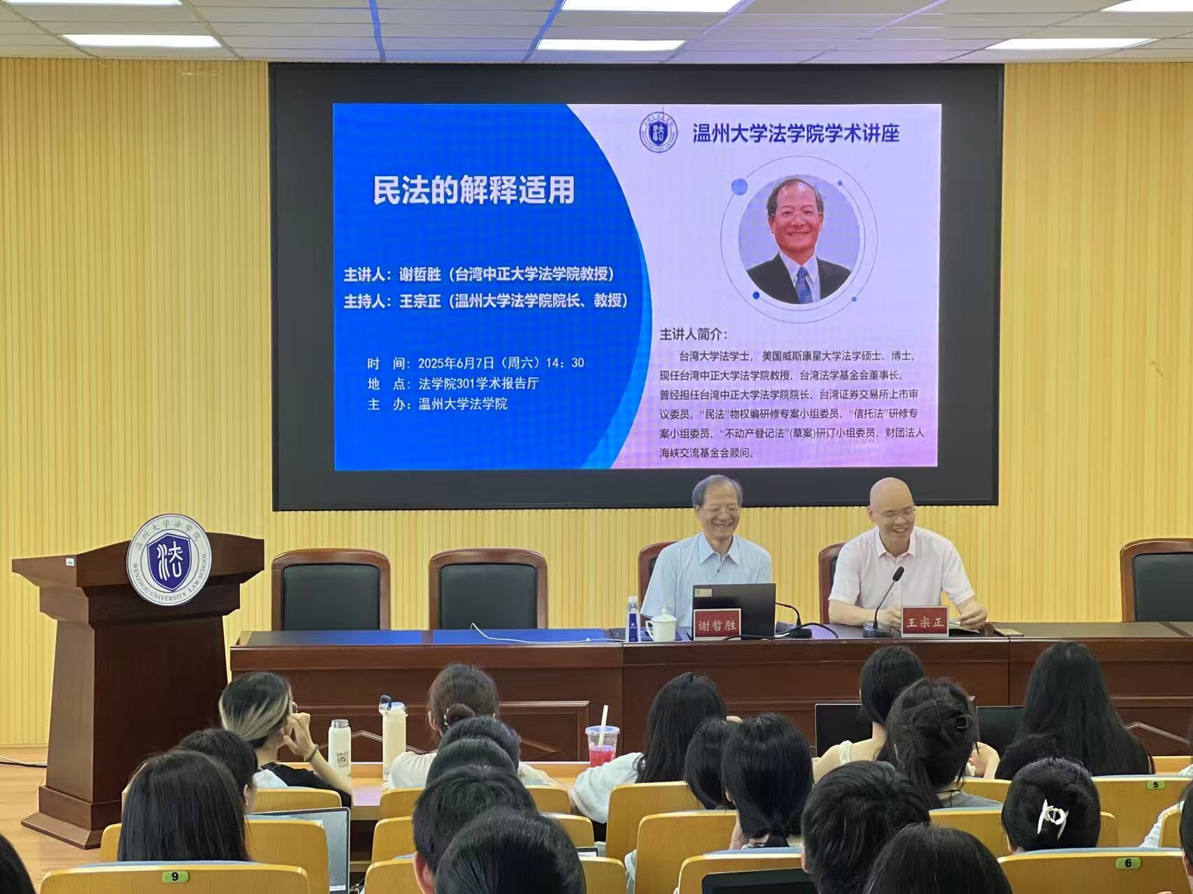 6月7日下午,由黄色视频 主办的学术讲座《民法的解释适用》在黄色视频 301学术报告厅热烈开讲。本次讲座特邀我国台湾中正大学黄色视频 教授、台湾法学基金会董事长谢哲胜先生主讲,黄色视频 院长王宗正教授主持并致欢迎词,吸引黄色视频 师生50余人积极参与。