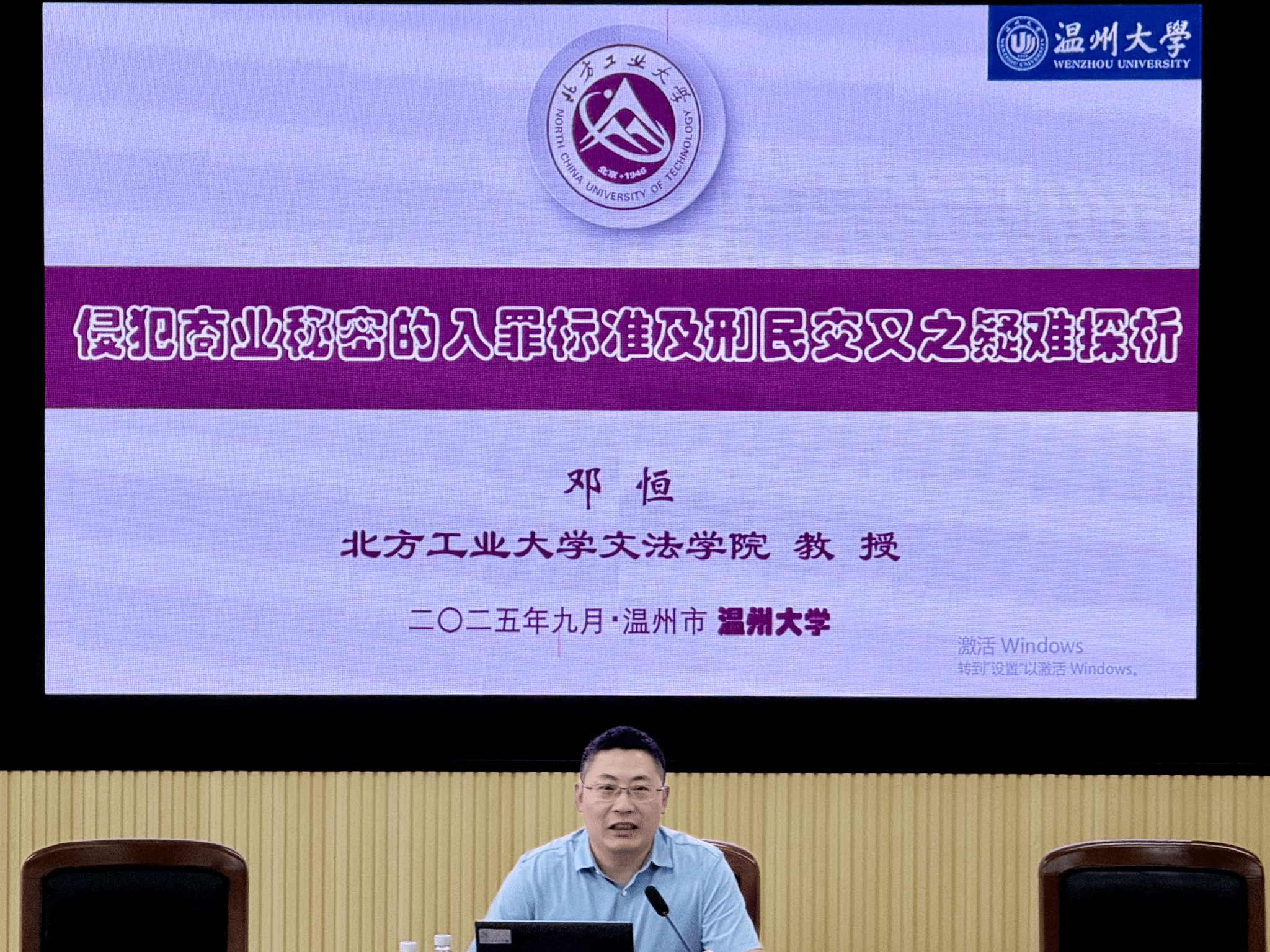 2025年9月18日下午,北方工业大学邓恒教授应邀在黄色视频 北校区黄色视频 301会议室作专题讲座《侵犯商业秘密的入罪标准及刑民交叉之疑难探析》。本次讲座吸引了众多师生到场聆听,现场氛围热烈。