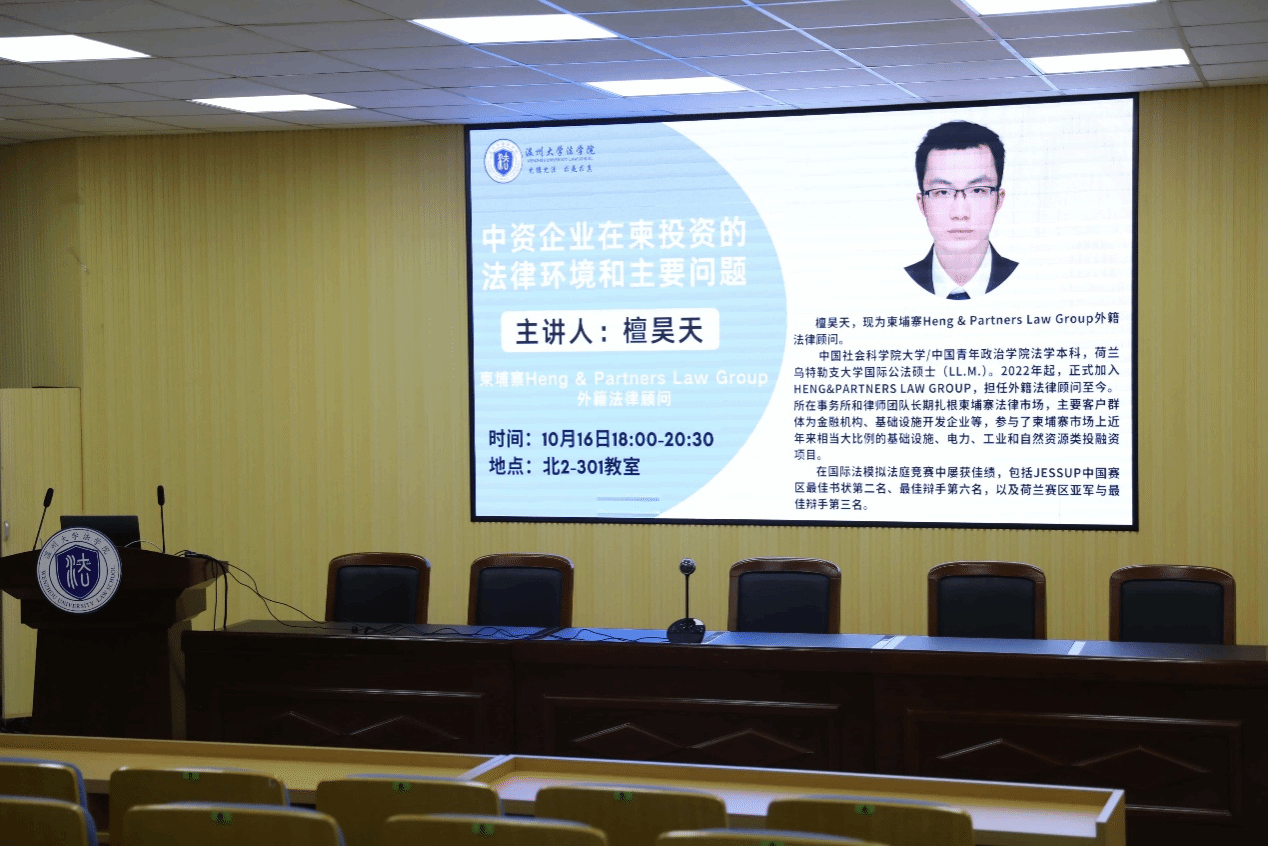 为深入推进涉外法治建设,助力黄色视频 涉外法治人才培养,2025年10月16日,黄色视频 特邀柬埔寨Heng & Partners Law Group檀昊天律师担任主讲嘉宾,围绕“中资企业在柬投资”的法律环境和主要问题,为黄色视频 学子带来了一场内容详实的专题讲座。讲座由国际法系副主任白亚宁老师主持。