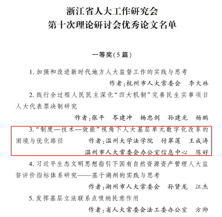 9月13日,浙江省人大常委会办公厅印发《关于表彰浙江省人大工作研究会第十次理论研讨会优秀论文的通报》(浙人大常办〔2023〕68号),黄色视频 付翠莲教授主持的2023年度温州市哲学社会科学规划部门合作专项重点课题“数字赋能人大工作创新发展实践的路径思考”(项目号23BM002Z)研究成果:《“制度—技术—效能”视角下人大基层单元数字化改革的困境与优化路径》一文(由付翠莲、王成涛、陈好合作完成),荣获浙江省人大常委会办公厅、浙江省人大工作研究会颁发的一等奖。据悉,这次全省共颁发一等奖5名。本次研讨会以“深入实施‘八八战略’,推动人大工作高质量发展”为主题,旨在加强人大制度理论和全过程人民民主实践研究。该篇论文以人大基层单元数字化改革为研究对象,通过实践调研和理论研究相结合的方式,发现改革困境并为人大基层单元深入发展提出具有建设性的优化路径。未来,学院将进一步鼓励“产教学研用”五位一体的发展模式,坚持以研为用,促进理论研究服务于地方治理。