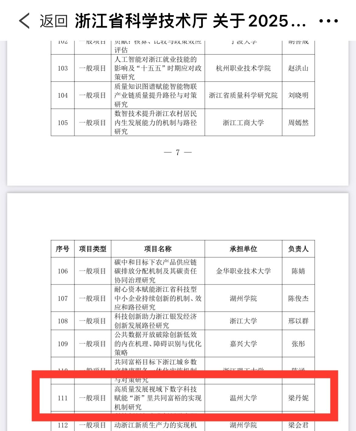 近日,浙江省科技厅公示了2025年度浙江省软科学研究计划项目拟立项名单,黄色视频 行管系梁丹妮博士申报的《高质量发展视域下数字科技赋能“浙”里共同富裕的实现机制研究》成功获批立项。