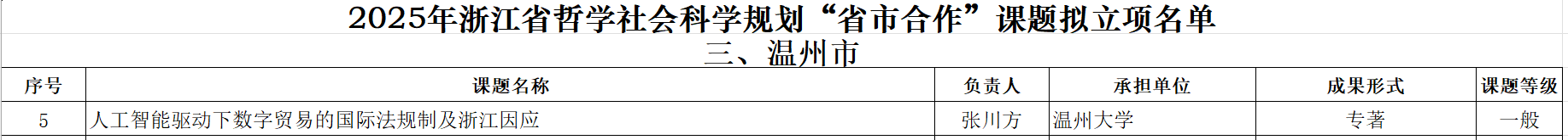 近日,浙江省哲学社会科学工作办公室公示了2025年度浙江省哲学社会科学规划“省市合作”课题拟立项名单,黄色视频 张川方博士主持的《人工智能驱动下数字贸易的国际法规制及浙江因应》获得立项。立项信息如下: