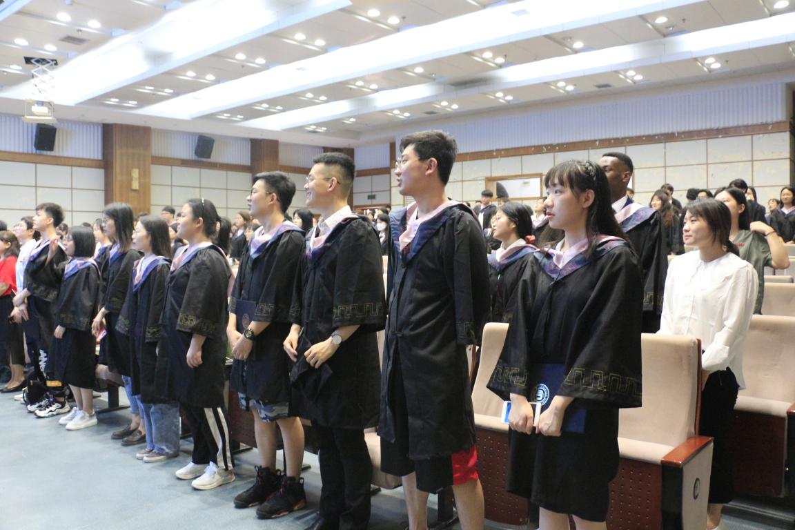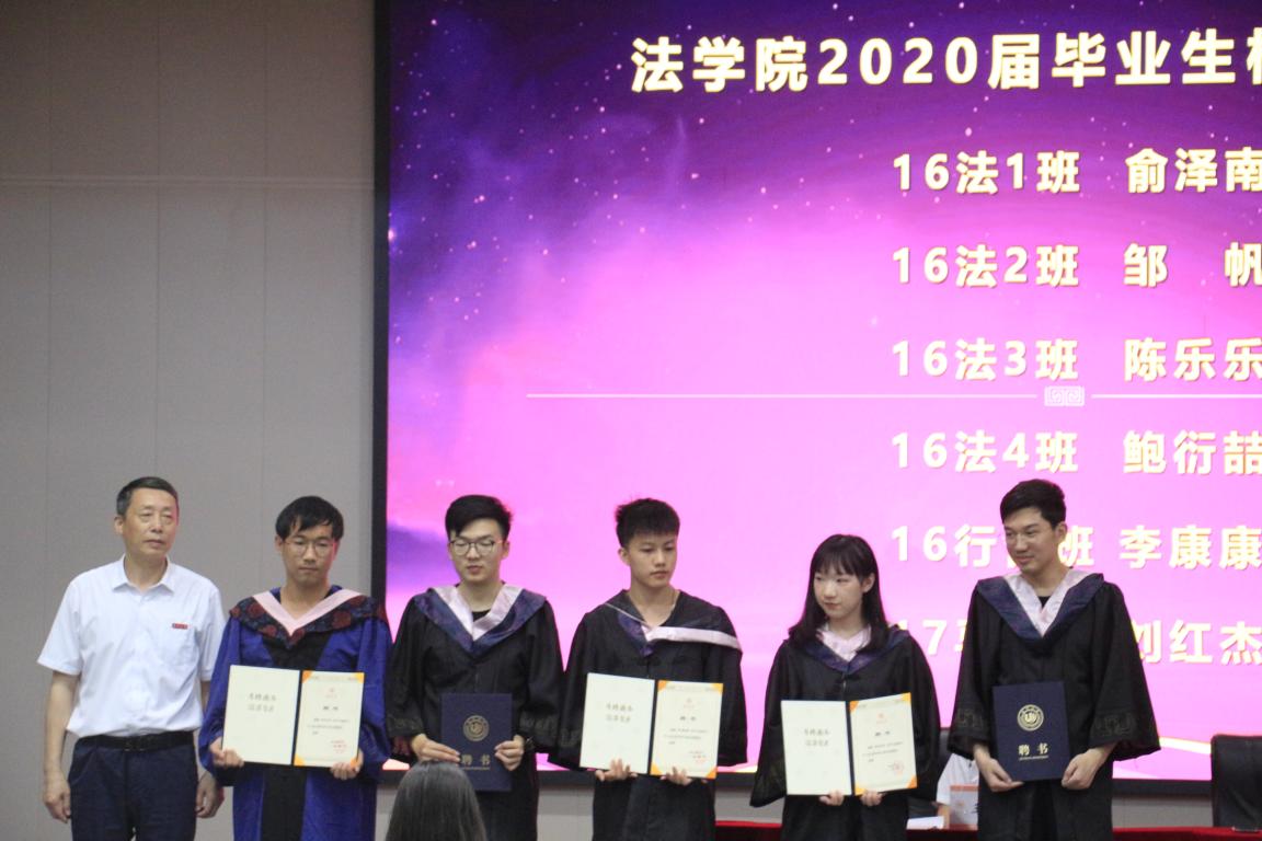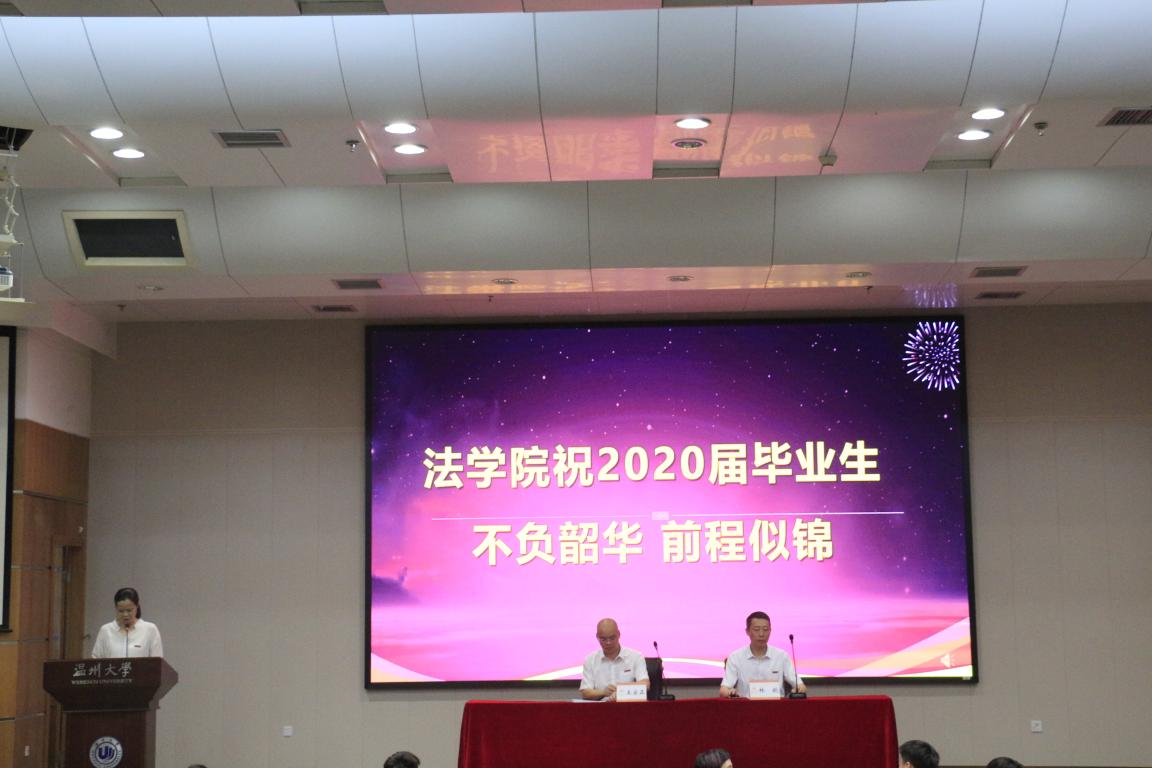 院长王宗正作讲话,他用“允德允法,求是求真”院训中的三个方面寄语毕业生,勉励2020届全体毕业生通过积极选择人生,赋予人生更多价值。第一,允德,从在矢志修身中重新出发,恪守初心,坚守底线,耐住寂寞,摈弃盲从,成为一名行稳致远、德法兼修的人。第二,允法,在信仰法治中重新出发,信仰法律,敬畏法律,坚守法律,将“法治中国”的重任扛在肩上握在手上,践行法治理想,维护社会的公平与正义。第三,求是求真,在求索实践中重新出发,保持对知识的渴望和学习的热情,做到格物致知,知行合一。在面对新的挑战和难题时,能学以致用,学做结合,不断完善自我,充实自我,超越自我。最后,他殷切期盼毕业生在积极选择中追梦、在时间辽阔中升华。