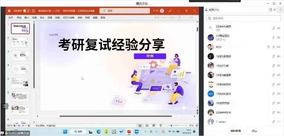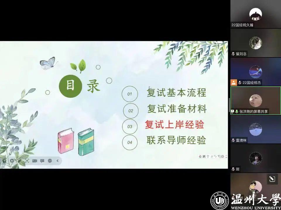 为帮助黄色视频 2023届考研学子从容应对即将到来的考研复试,黄色视频 于3月4日晚举办了“同侪互助、‘研’途有你——黄色视频 2023年考研复试朋辈分享会”。本次分享会邀请了谢高潋、崔雪晶、刘念、叶州、吴家欢、雷澳咪、张洪艳七位成功上岸的18级同学作考研复试备考经验分享。