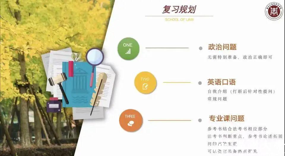 考取南京师范大学的吴家欢学长建议我们要善于利用网络上的信息资源,熟知与报考专业相关的英语词汇。对于复试需要提交的材料务必仔细检查,以防纰漏。回答专业课问题时要逻辑清晰、自信大方,注重“法言法语”。