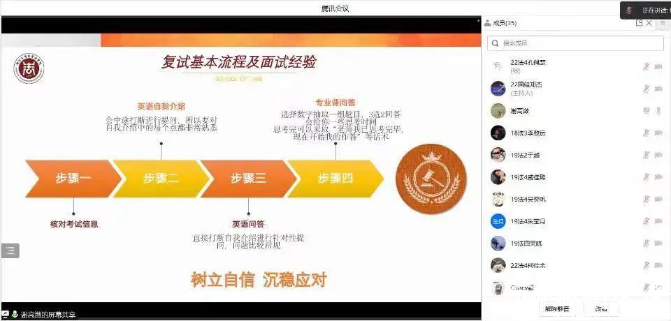 考取华东师范大学的叶州学长分享了他的面试经验,即模拟练习和熟能生巧。这两方面可以和几个同学一起练习,在熟知面试流程的同时缓解紧张。此外,他强调心态很重要,要展示自己良好的精神风貌,在面试时务必和每个导师进行眼神交流。关于专业课问题,他建议我们既要研究往年真题,也要熟悉近几年讨论的新问题,从基础概念、相关知识关联和列举案例这几方面有逻辑地回答。