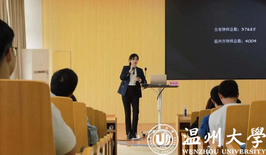 来自浙江震瓯律师事务所的合伙人律师、中国政法大学在职研究生金怡怡学姐,在讲座中为同学们揭晓了律师行业的真实面貌。金怡怡律师打趣道,律师并非都如电视剧中展现的那般光鲜亮丽,律师在现实中也要面临巨大的工作压力和残酷的行业竞争。接着金律师讲道,即使这样,自己依旧坚定选择这份职业的理由:可以运用法律知识捍卫他人的权利,在法庭上扭转乾坤、反败为胜,并从中感受巨大的成就感和充实感。在提到如何成为一名优秀的律师时,金律师认为,首先要对自己有清晰的定位;在经营口碑的同时,培养丰厚的知识储备和灵敏的市场嗅觉;习得自律的生活方式、培养终身学习的习惯。此外,金律师还强调了平台资源的重要性,“酒香也怕巷子深”,巧妙利用互联网适当营销自己也很重要。最后,金律师勉励同学们在仰望星空的同时,也要脚踏实地做好本职工作,律师行业虽然初期非常辛苦,但只要肯夯实基础、保持住对未来的期望,同学们定能拨云见日,逐梦彼方。