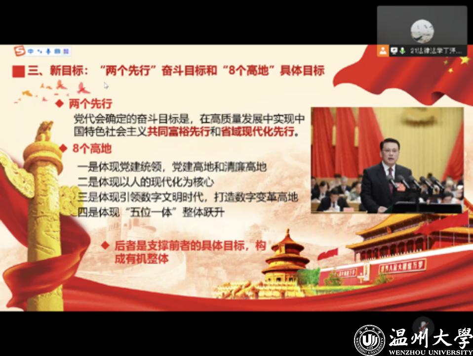 2022年7月19日晚在支部的组织下一起学习了省党代会精神。浙江是一个教育强省,习近平总书记明确要求浙江,以人才为本,深入实施人才强省战略,推进创新型省份和科技强省建设。作为发展在浙江的一名法科学生,新征程已经开启,新蓝图催人奋进。我将努力会以实际行动,为浙江争光、为人生添彩,为实现中华民族伟大复兴的中国梦作出新的更大贡献!对于省党代会的精神真正做到内化于心、外化于行。我将进一步牢固树立“四个意识”,坚定“四个自信”,拥护“两个确立”,做到“两个维护”,进一步坚定理想信念,拧紧思想“总开关”,把思想和行动统一到党代会精神上来,奋力开创美好未来,赢得更大荣光!