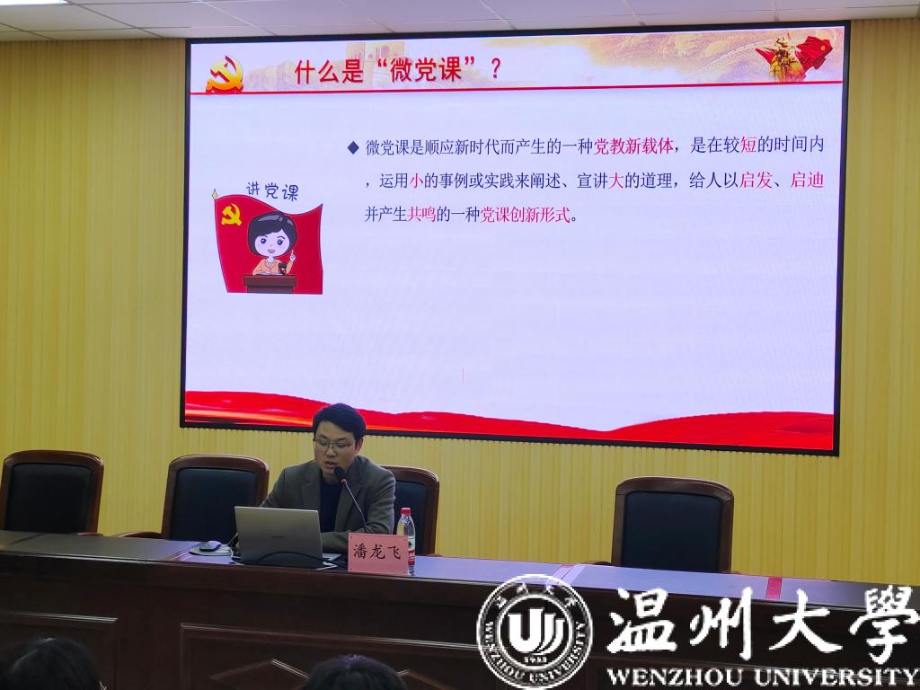 11月24日晚,电气与电子工程学院潘龙飞老师以“如何讲好一堂微党课”为主题开展专题讲座。潘龙飞老师以“什么是微党课”为切入点,指出微党课是顺应新时代而产生的一种党教新载体,是在较短的时间内,运用小的事例或实践来阐述、宣讲大的道理,给人以启发、启迪并产生共鸣的一种党课创新形式。他用丰富的案例讲解了“微党课”的内容组织形式,阐述了“微党课”的细节处理问题。