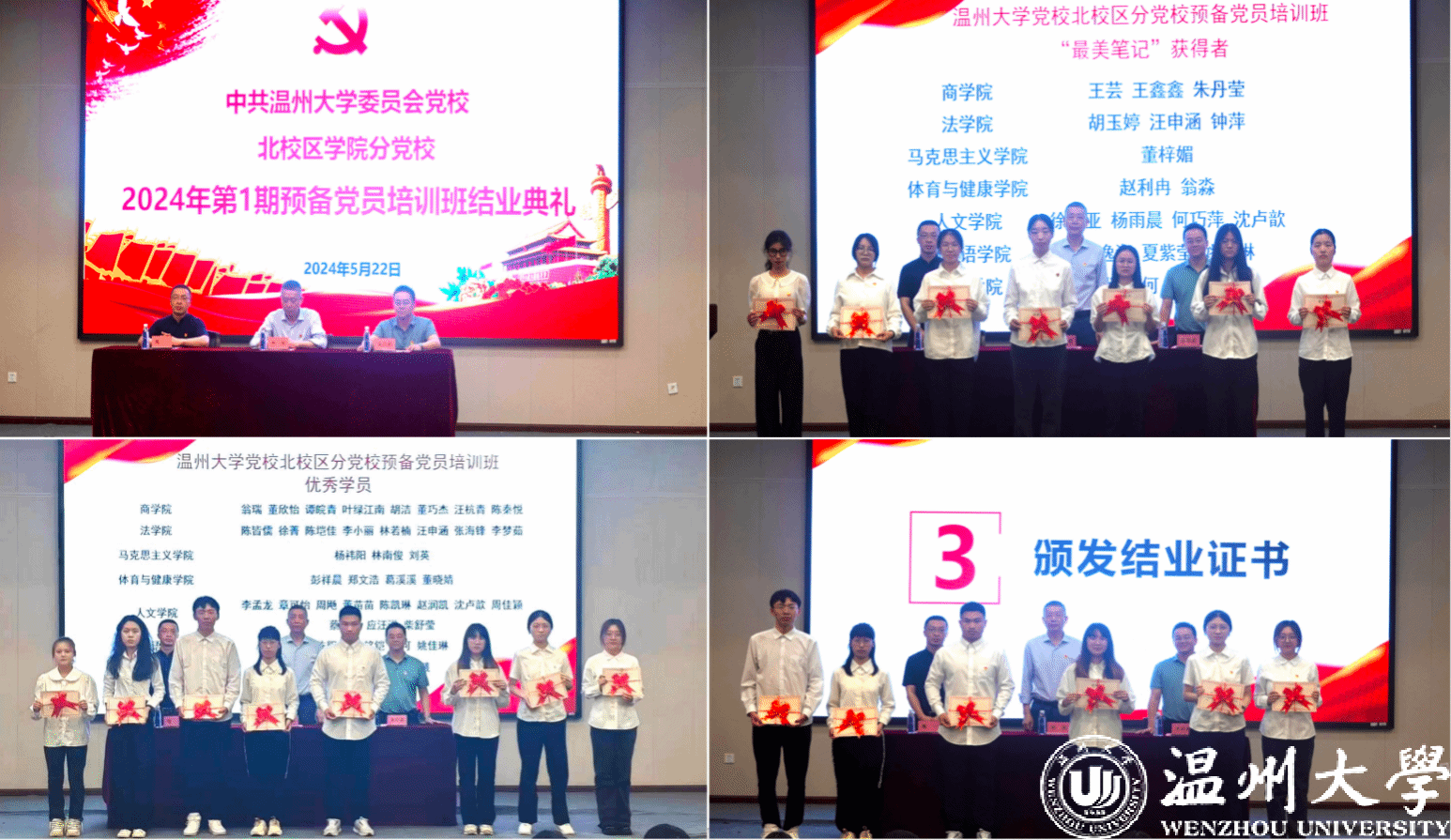 最后,出席本次结业典礼的各学院分党校校长林钦老师、 朱启鑫老师、人文学院党委副书记魏一老师为顺利结业的186名预备党员颁发结业证书,并分别对优秀学员和最美笔记获得者进行表彰。