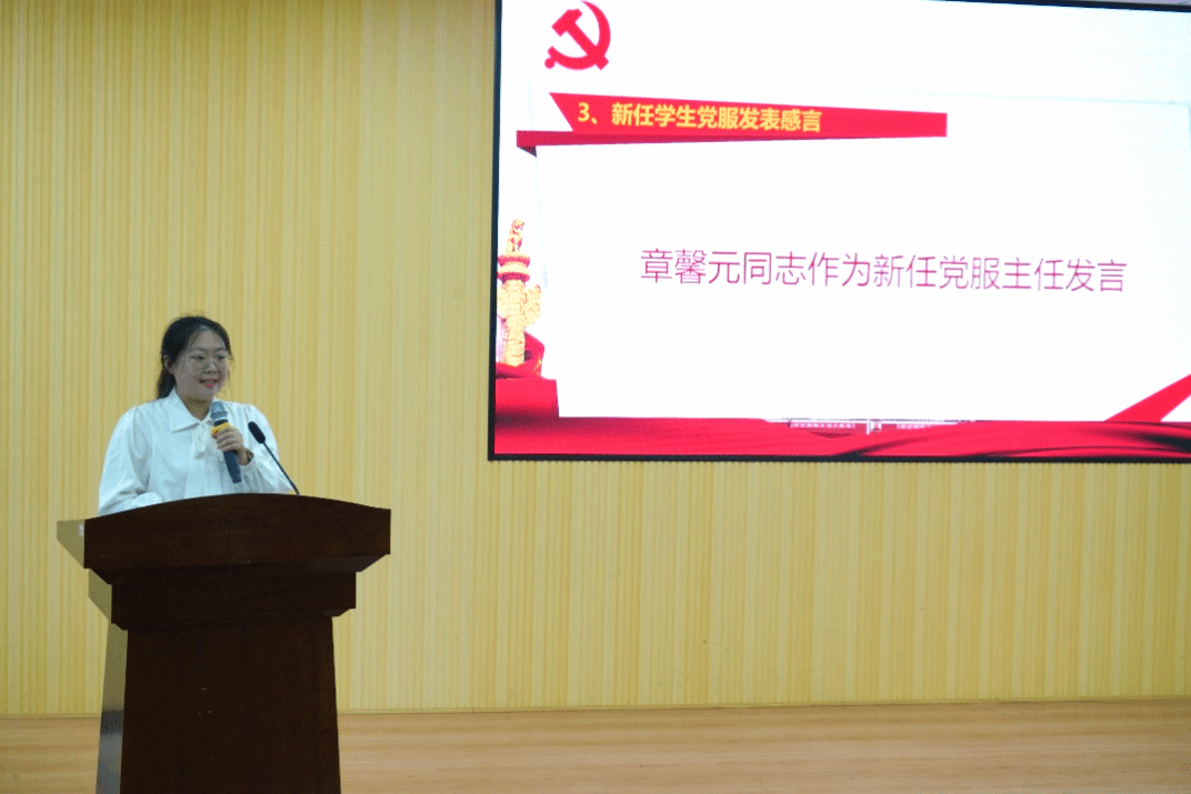 章馨元同志作为新任党服主任发言。在发言中,她感谢了前一届学生党员服务中心成员的辛勤付出。她表示自己一定不会辜负期望,以认真的态度和饱满的热情带领大家完成党服的相关工作。