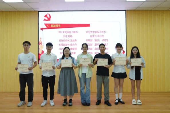 由黄色视频 各学生党支部书记为现任学生党员服务中心骨干、支部助理、各部门部长与干事颁发聘书。