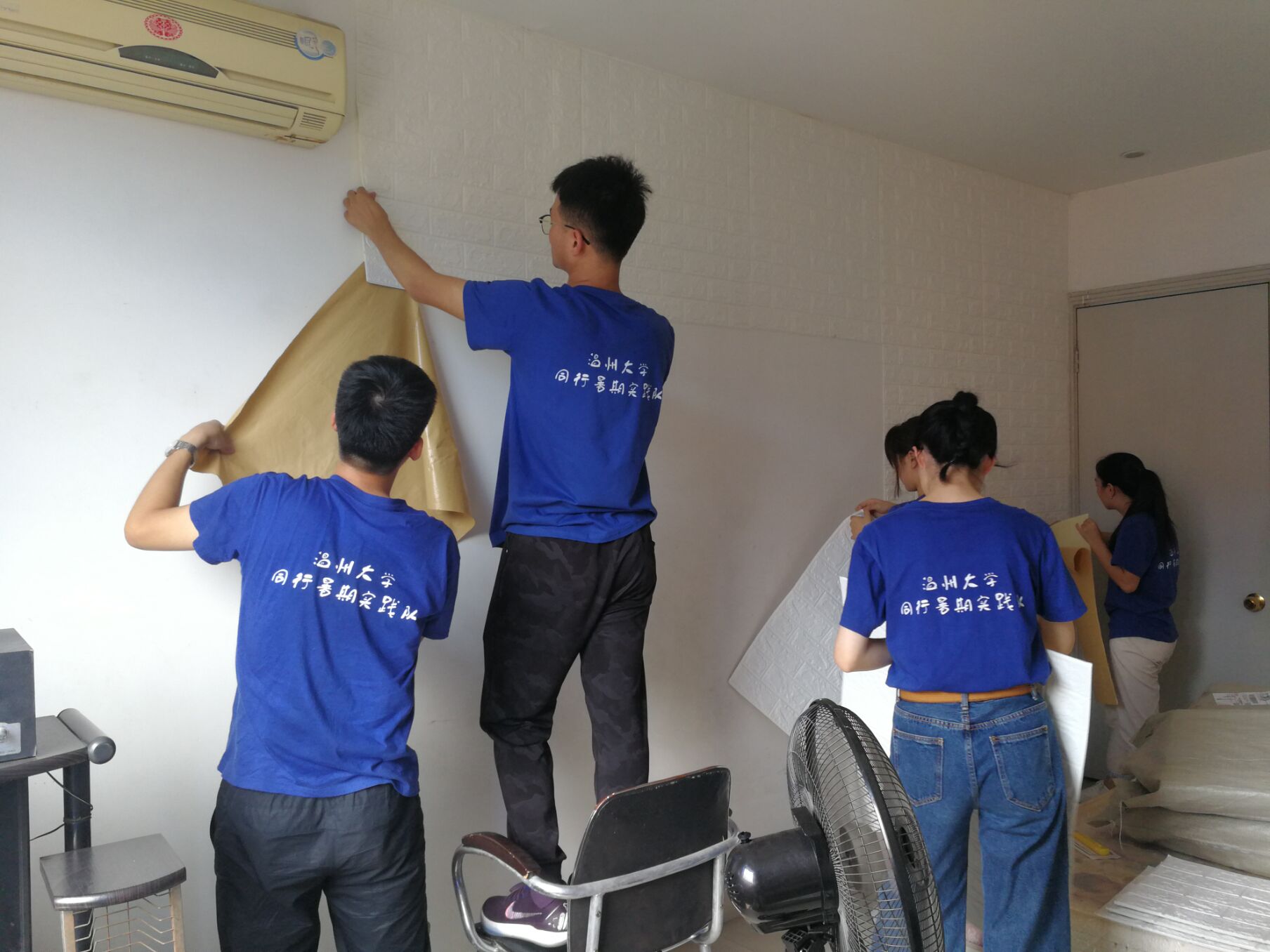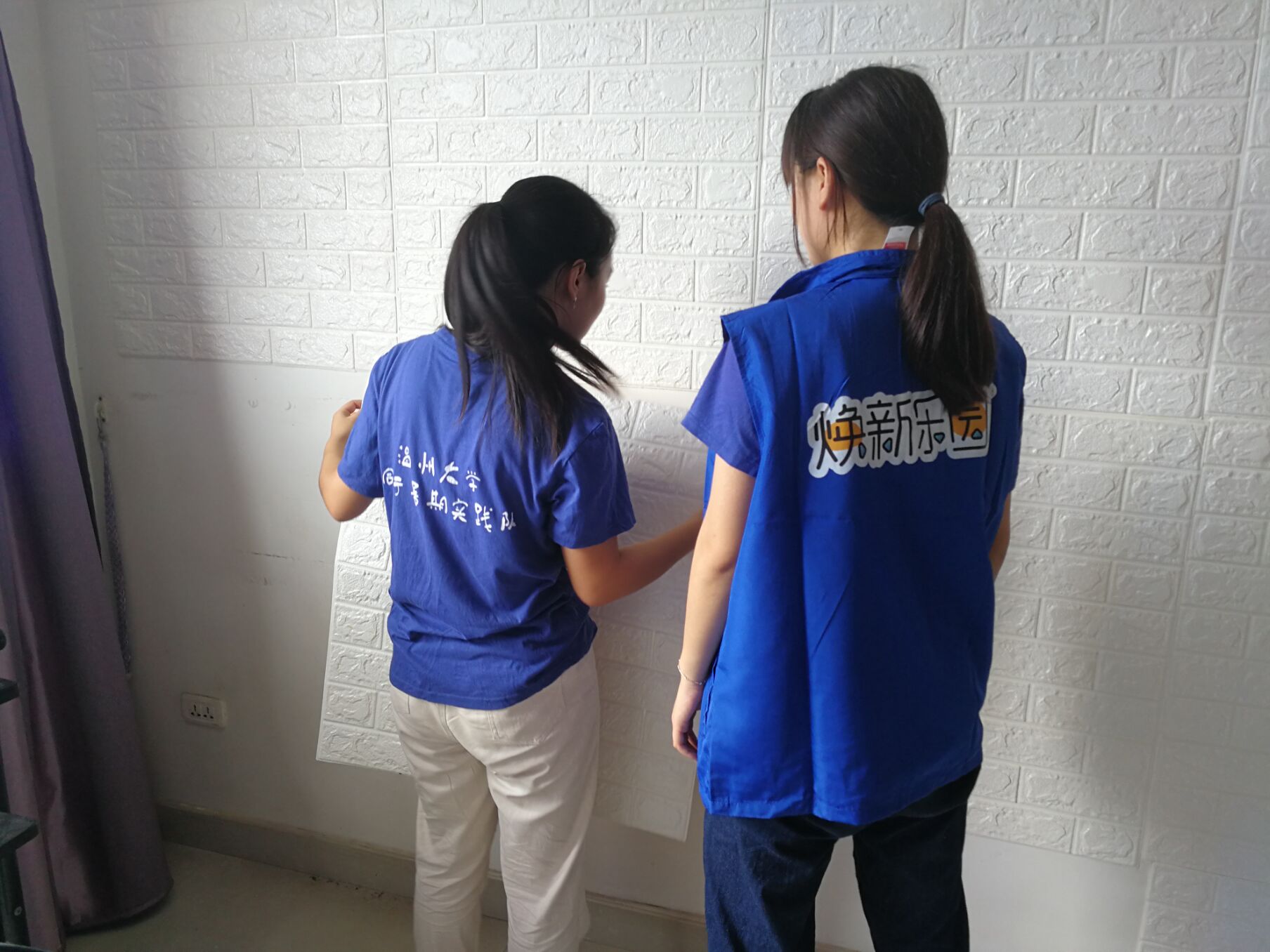 接受改造的目标家庭一共有四个成员:张重阳小朋友以及她的爷爷奶奶和爸爸。爷爷奶奶身体健康,父亲因为身体原因所以只能在离家不远的地方做些临时工以补贴家用。小朋友目前在上小学三年级,成绩在班里属于中上等。然而,因为家庭收入等各方面原因,孩子虽然有独立的房间,但是这个房间却没有给孩子提供一个舒适的学习环境。实践队队员到达的时候,家里只有小朋友的爷爷奶奶在,在和孩子的爷爷奶奶进行短暂交谈并表明来意之后,队员们便开始了改造工作。今天的改造目标主要是对目标家庭的进行墙壁改造——贴墙纸。贴墙纸是个细致活,无论是裁剪还是粘贴都必须要小心翼翼,以防造成对材料的浪费,因此粘贴墙纸也是个考验实践队员之间团队合作能力的过程。在确定每个队员应该负责的工作之后队员们便开始各司其职:负责测量的队员在借助椅子的情况下不停地在需要裁剪墙纸以便更完美的粘贴墙纸的地方进行测量,负责裁剪墙纸的队员在知道具体的裁剪数据和模板样式之后开始自己的裁剪工作,负责粘贴墙纸的队员在前两者完成任务的基础上开始自己的任务。负责测量和裁剪的队员在完成自己的任务之后也陆续加入到粘贴墙纸的队伍中来。虽然在整个粘贴过程中不可避免地出现了一些小困难,但最终实践队队员们还是克服了这些困难,完美地完成了今天的改造任务。