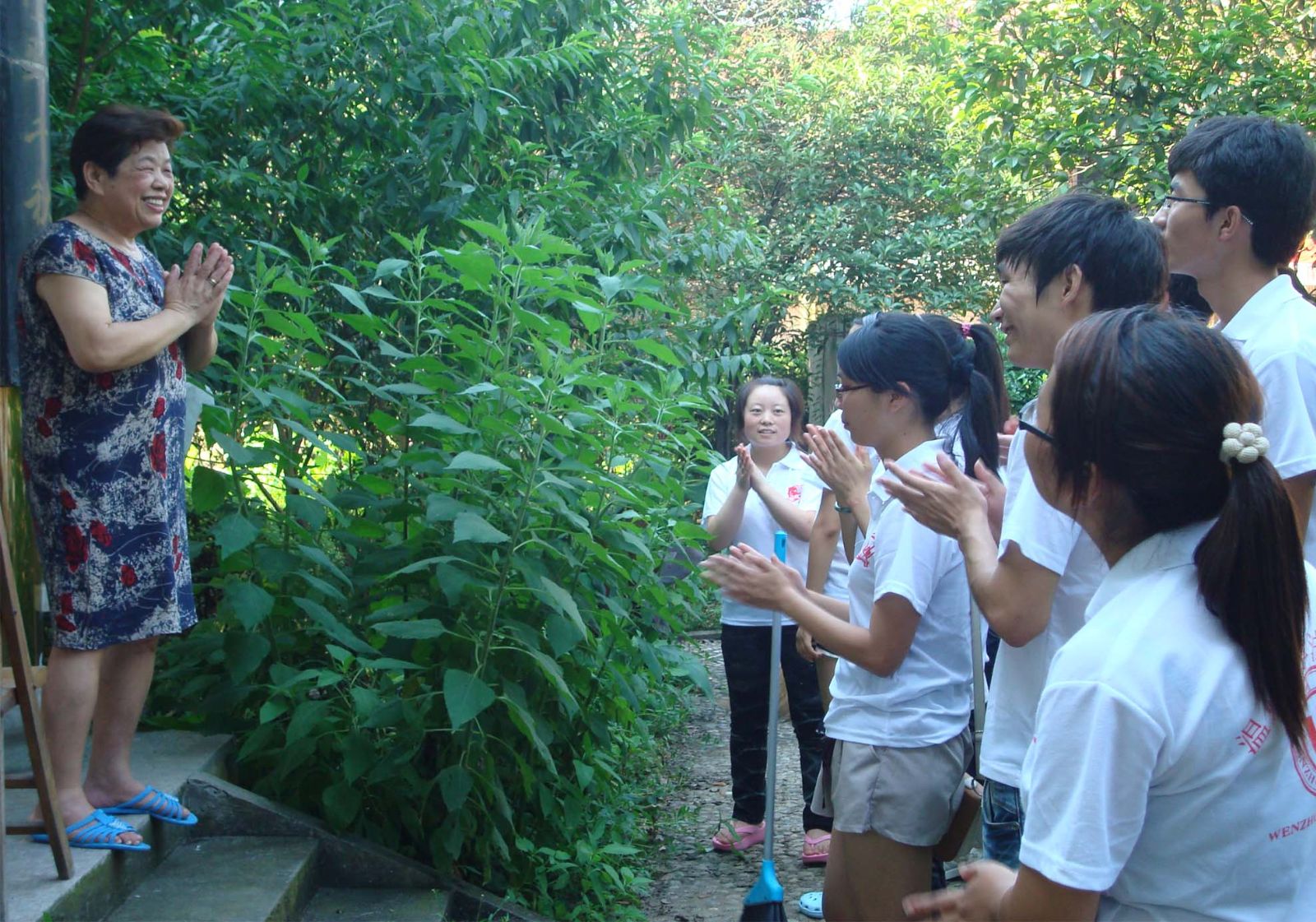 与爱同行实践队提前为老人准备好了西瓜,到敬老院的第一项活动就是为老人分发西瓜,实践队员们有的负责切西瓜,有的负责把西瓜分给老人,有的则很热情的和老人聊天,给老人扇扇子解热。老人们也很热情的露出一张张慈爱的笑脸。另外,实践队员也帮敬老院打扫了凉亭,以供老人乘凉。在打扫凉亭之前,乔心敬老院院长给队员们讲了敬老院的创办,以及创办以来的经历。由此,我们知道了院长创办敬老院只有一个坚定的信念—爱家乡,爱祖国,为祖国奉献自己的每一份爱心。在队员们适当的分工与合作以及积极的配合下,终于在下午5点多实践队的活动圆满结束,最后实践队员和院长合影,和老人告别。