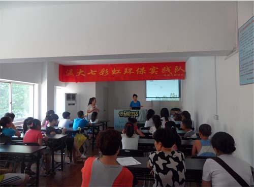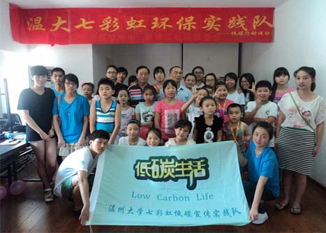 首先实践队队员介绍了低碳网站的基本构成,并以有奖问答的方式引来了居民们的积极参与。随后进行的"低碳之星讲低碳"活动由两位社区内的小学生与三位实践队队员轮流上台演讲,内容包括他们低碳生活的心得以及对普及低碳生活的愿望。另外,在场的居民还分享了他们在生活中的低碳小秘诀,使人受益匪浅。演讲结束后,寻宝分类游戏紧张有序地进行着,参赛者以当地小学生居多。同学们在最快的时间里寻找到了分散在各个房间里的气球,并排队登记。气球全部找到后,所有参赛同学分为五组,在两分钟之内按着气球上贴着的纸条名称把气球投入标有"可回收垃圾","不可回收垃圾"等字样的袋子中。游戏过程中,同学们和队员们积极配合,现场气氛十分活跃。最后,实践队按游戏两轮的总分排名,给予了同学们相应的奖励。