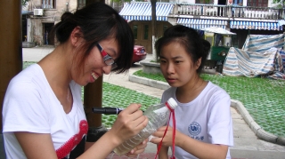 早上,第三小分队从水头出发鳌江镇,来到了瓯南大桥附近,用事先准备的塑料瓶,绳子,又在附近找了块石头作为重物,将瓶子沉入水面以下0.5米,采得水样。接着我们徒步跨越瓯南大桥,来到对岸的龙港镇。顺流而下来到下埠村附近流域,取得水样。接下来,我们坐车直下至鳌江出海口。由于到达的时间刚好赶上海水退潮,我们未能取到水样。于是我们又重新选择了一个距离出海口较近的取水点——新美洲村流域,在船舶港口处取得水样。