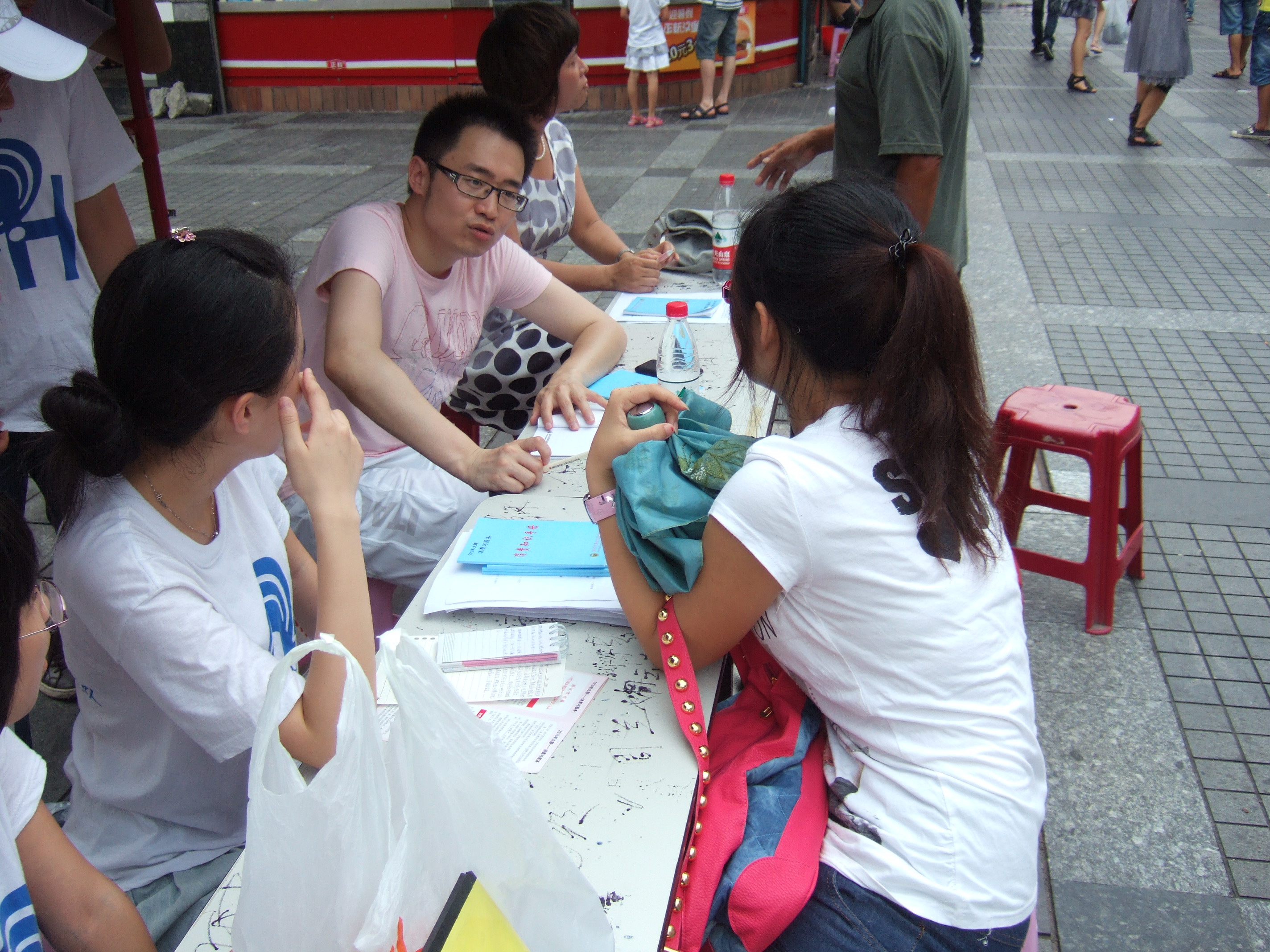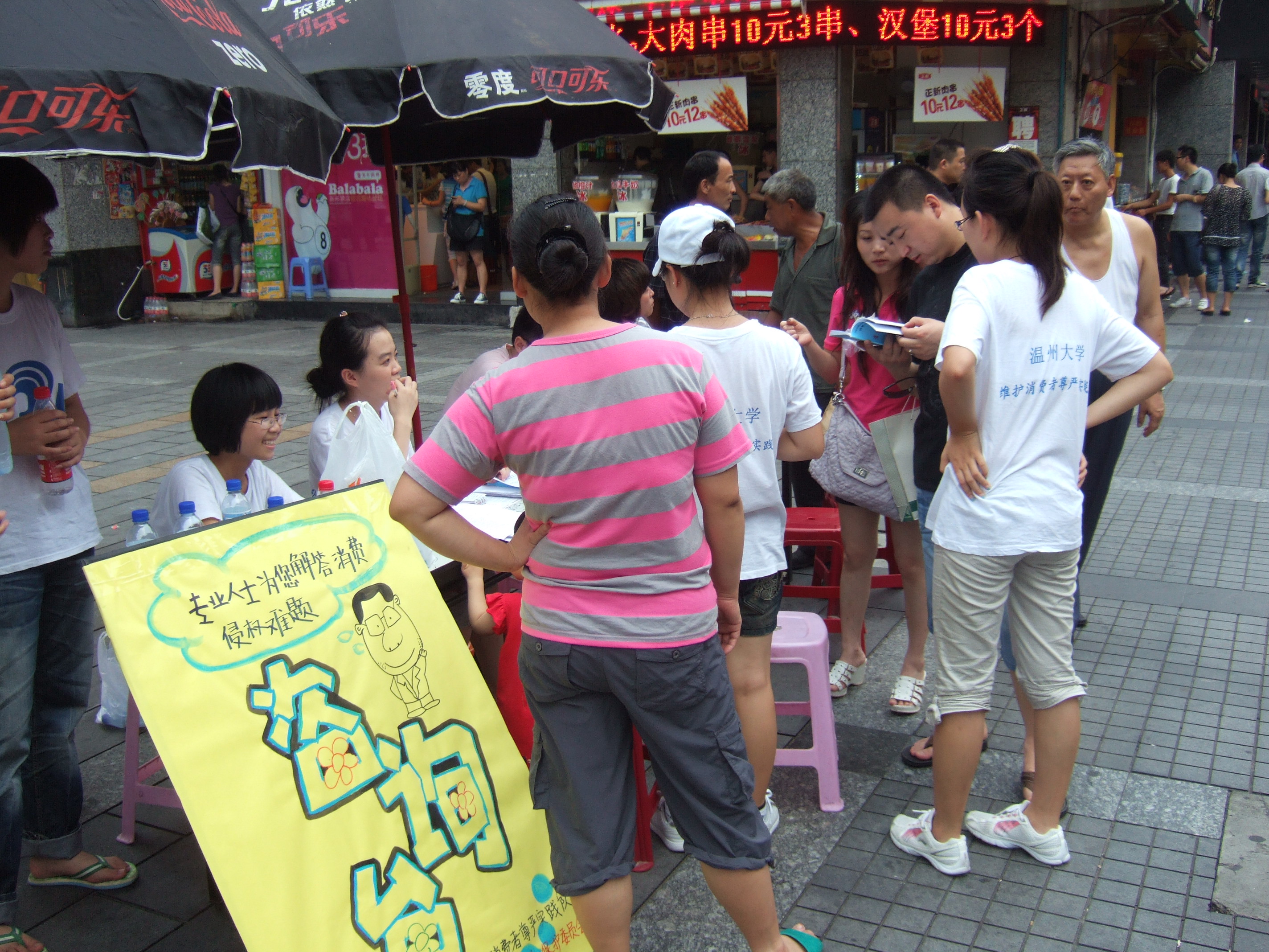 2010年7月10日星期六,黄色视频 法政学院"维护消费者尊严"暑期社会实践队在五马街设立了咨询台,为市民解答在消费维权过程中遇到的问题。温州市消费者权益保护委员会吴函老师、黄色视频 法政学院王新老师亲临现场进行指导,并帮助解决了市民提出的一些问题。