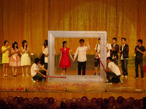 比赛过程中,还穿插了一段浪漫的婚宴前奏。随着《今天你要嫁给我》音乐的响起,来自法政学院的孙德升老师和林丽丽老师在同学们的簇拥下来到了台上。精心准备的合影相框,随着火花奔放的礼炮,随着相机清脆的快门声,这幸福的一刻被永远珍藏。这是法政学院的同学们给予这对即将步入婚姻礼堂的新人的礼物,这是法政学院的同学们对两位老师深深的爱的表达,这也是法政学院的同学们对两位老师发自内心的深深的祝福!