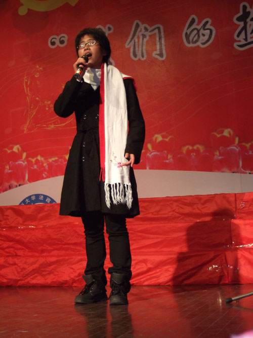 12月1日晚6:30,法政学院"学习十七大 建和谐法政"主题系列活动之"我们的热血青春"红歌会在南校区音乐厅隆重上演。出席的嘉宾有法政学院党总支书记陈国治、副院长朱选华、辅导员孙德升和陈颖老师,校学生会副主席袁锋、主席助理胡恒琦,美术学院团委副书记孙娜妮以及法政学院前学生会主席丁一民等。