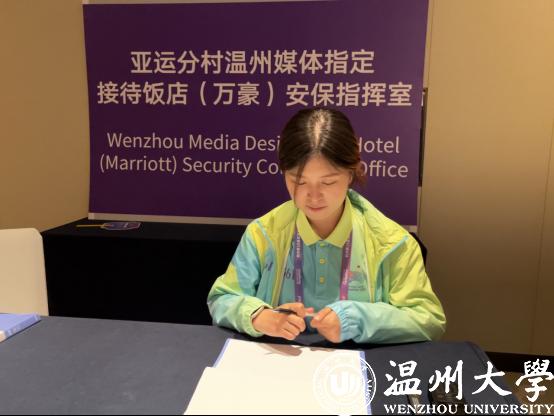 志愿感言:十九届杭州亚运会是史上规模最大、覆盖面最广的一届亚运会,作为一名志愿者,能参加亚运温州赛区的安保工作是我的幸运。我被分配到亚运分村媒体接待酒店的安保部门,负责的安保工作,主要是在安保指挥室负责值守,及时上报出现的问题,对酒店的消防通道进行巡查。履行职责的过程提高了我的团队合作能力,我学会了与来自不同文化背景的工作人员合作,学习了如何在团队中有效沟通、分享任务和解决问题。通过密切协作,我们顺利地完成了安保任务。在志愿者团队中,我与其他工作人员紧密协作,互相支持。大家共同努力,为亚运会温州分会场创造了一个愉快和安全的环境。