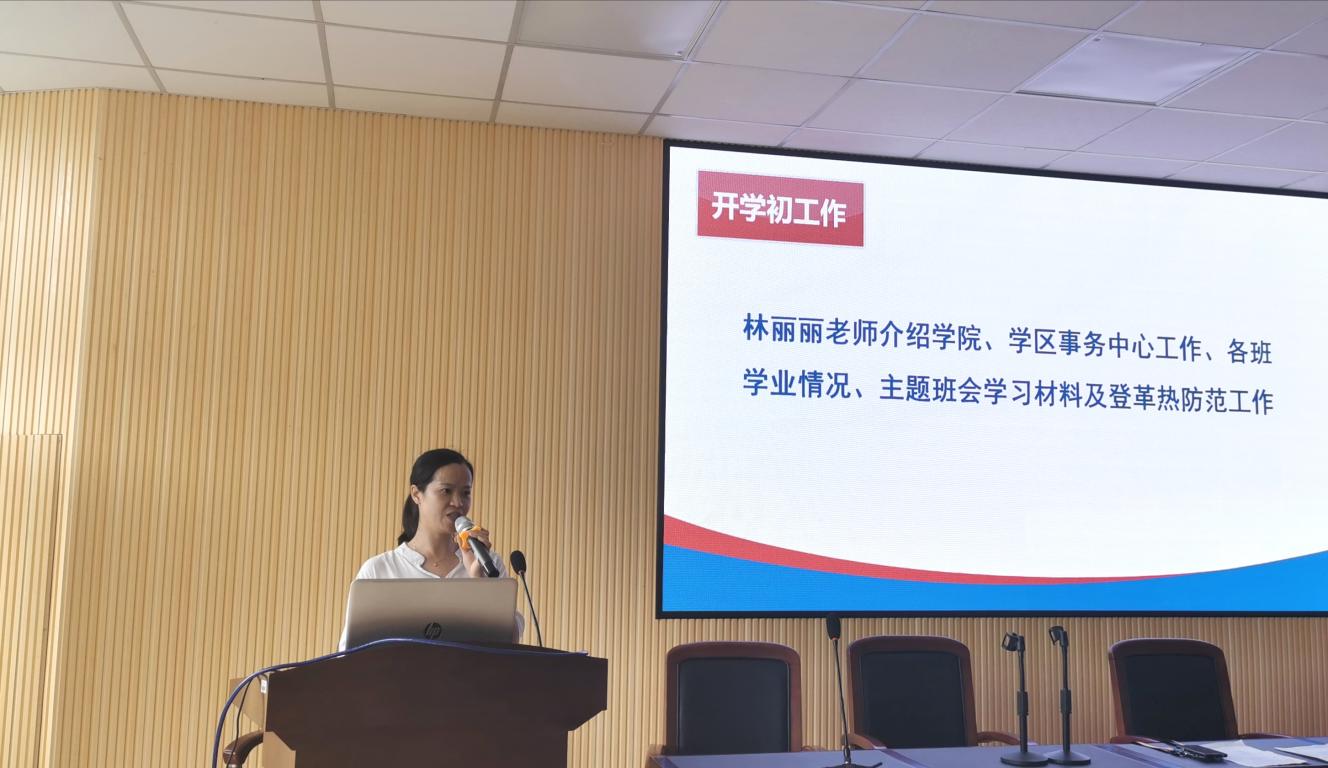 林丽丽介绍了学生科辅导员分工与职责,就开学初学院、学区事务中心工作、各班学习情况、主题班会学习材料及登革热防范工作做了详细安排。