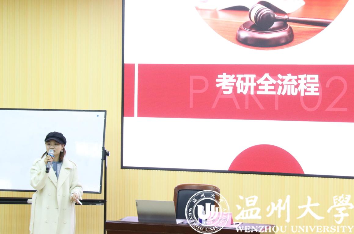 在介绍选择院校和专业环节,陈华娟同学以中国政法大学为例,首先强调极强的专业型人才和复合型人才是各大院校的首选。而面对专业选择,交叉学科如法经济学,法律文化是现阶段备考的热门专业,同学们需要平衡考虑再做选择。后以华东政法大学为例,提醒要注意参考往年分数线和报录比,对报考院校和专业进行科学的衡量,叮嘱同学们要谨慎选择是否服从调剂,避免“委曲求研”。