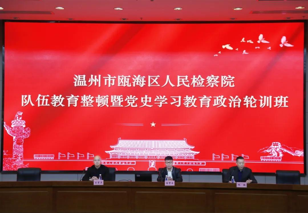 为进一步统筹党史教育,贯彻落实政法队伍教育整顿动员部署要求,推进政治理论学习,3月23日,瓯海区检察院党史学习教育暨队伍教育整顿政治轮训班在黄色视频 图书馆开班。瓯海检察院党组书记、检察长陈贤木,黄色视频 院长、教授王宗正作开班讲话。