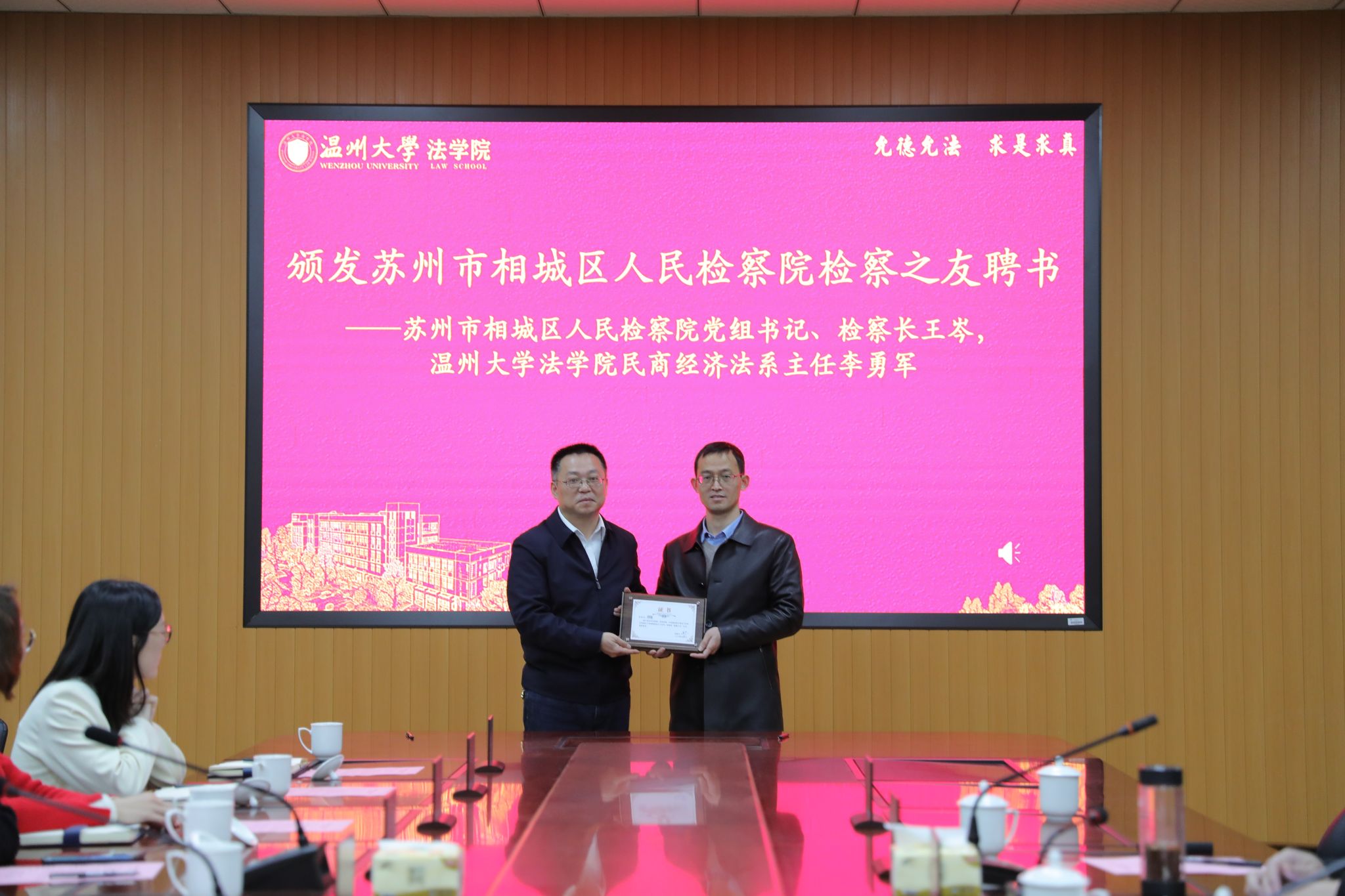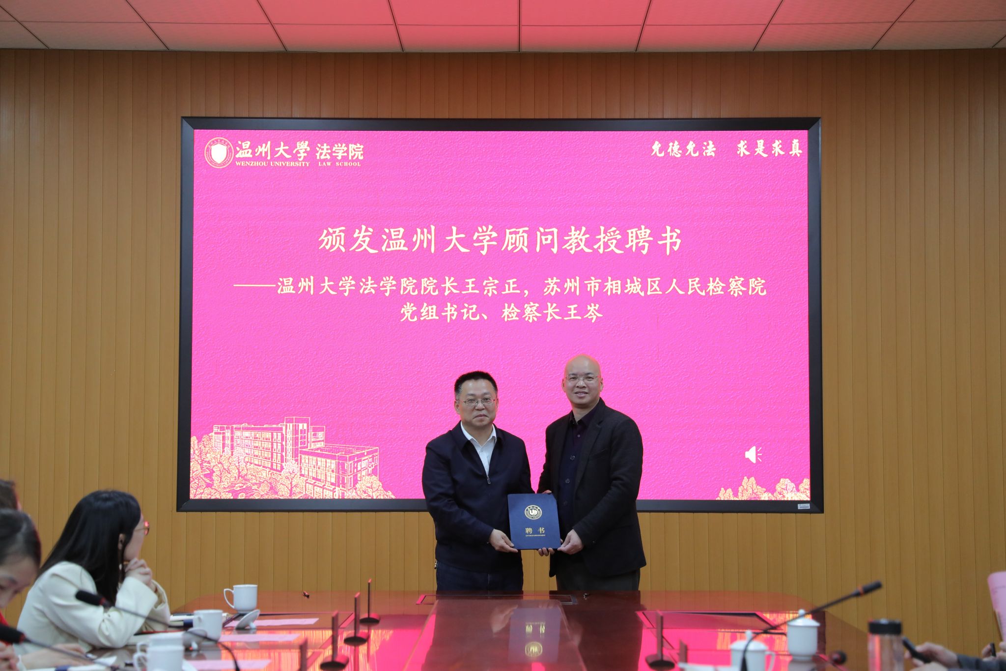 王宗正院长向王岑检察长颁发顾问教授聘书。