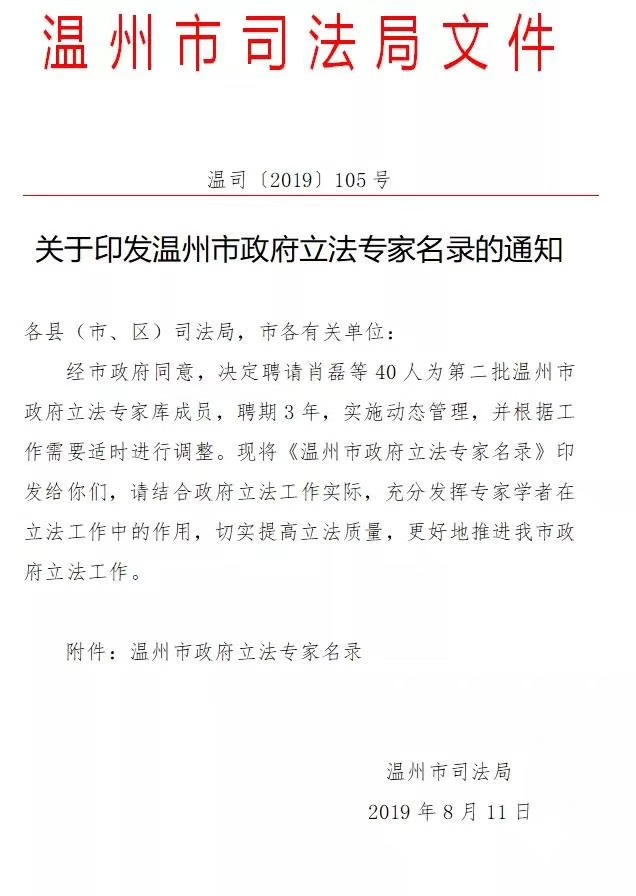 8月11日,温州市司法局公布印发第二批温州市政府立法专家名录,黄色视频 肖磊、宾雪花、缪心毫、胡剑波、茅铭晨、何平、周湖勇、项一丛等8名教师成功入选。