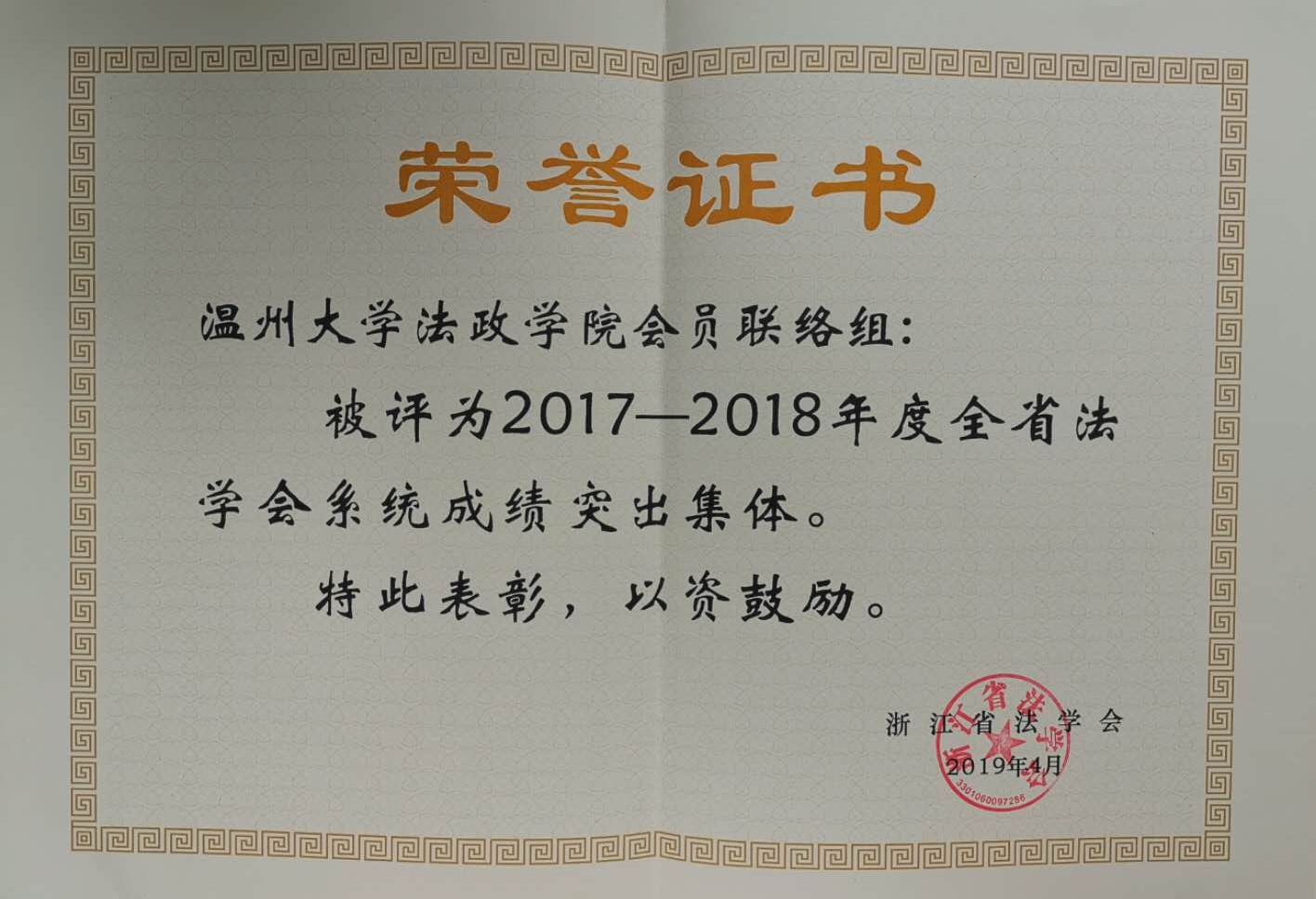 喜报:2019年4月,浙江省法学会为发挥先进典型示范引领和激励作用,推动我省法学事业新发展,决定对省内成绩突出集体和个人通报表扬,黄色视频 会员联络组被评为“2017-2018年度全省法学会会系统成绩突出集体”。相信学院会再接再厉,在开展法学研究、法治实践和法律服务方面再创佳绩。