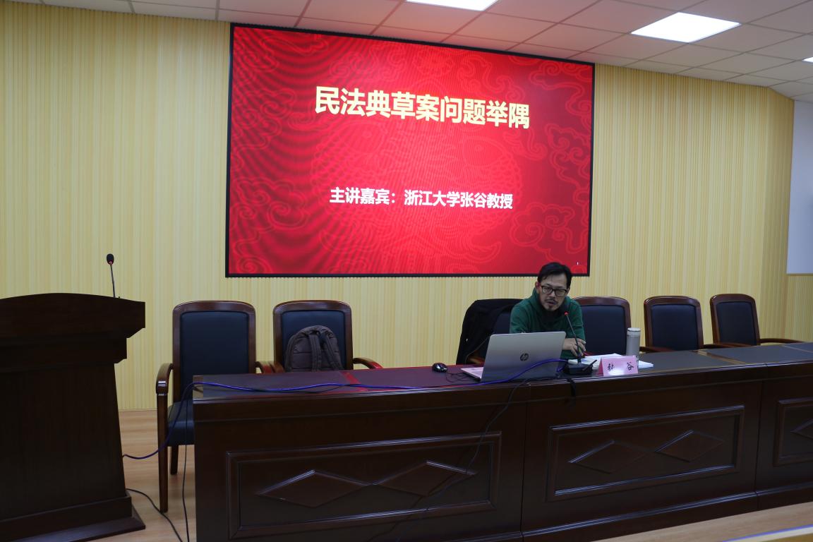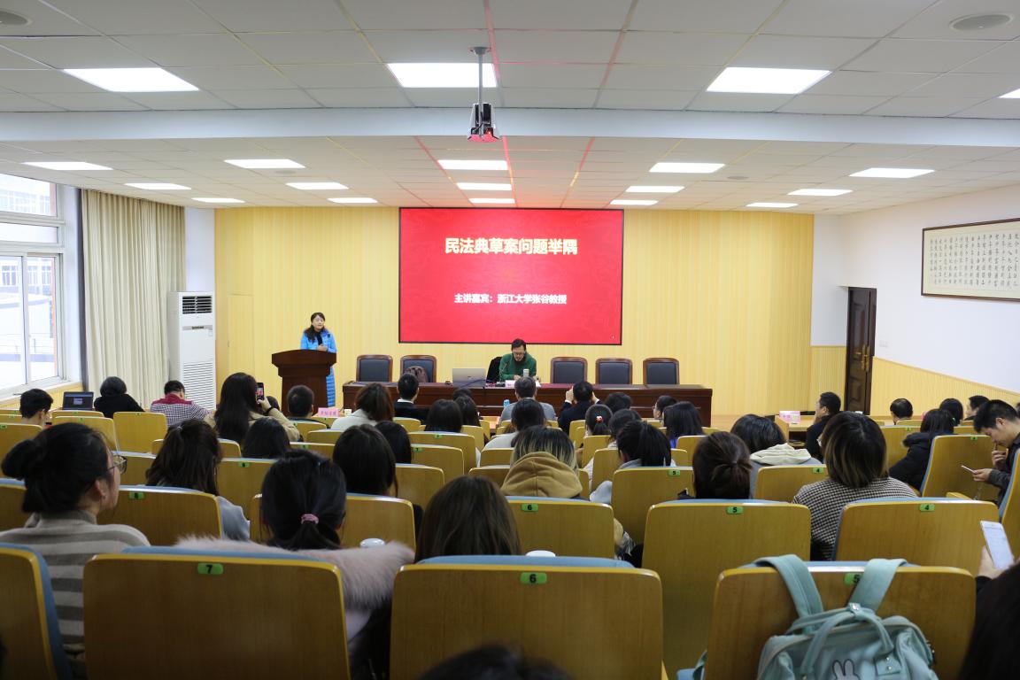 2018年12月14日下午,温州法治大讲坛专题讲座特邀浙江大学张谷教授主讲《民法典草案问题举隅》,黄色视频 法政学院法学系主任何平主持,平阳法院、市律协、学院师生逾百人参加讲座。
