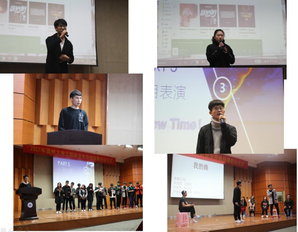 启动仪式伊始,主持人裴薛勤向同学们介绍了到场的嘉宾以及本次启动仪式的五个环节,分别是安全讲座、活动介绍、各学院节目表演、“爱星缘”介绍和分组展示。第一环节是由保卫科高顺德老师针对本次生存挑战为同学们带来的安全讲座,他阐明了本次比赛可以挖掘个人潜能、培养团队精神,重点强调了交通安全、通讯顺畅、切忌单独行动等方面。接下来是数电学院组织部部长方晓翠为同学们讲解本次生存挑战赛的相关细节,重点介绍了本次比赛的宗旨、目的、流程以及规则。第三环节是精彩的各学院节目表演环节,第一个节目商学院的小品“我的路”就将现场气氛推上高潮,数电学院的歌曲串烧、小品和法政学院的歌曲也同样精彩。表演环节结束之后,爱星缘儿童心理发展中心创办人胡温中老师向同学们介绍了“爱星缘”,讲述了自闭症儿童的世界。最后的环节为本次生存挑战赛的组员提供了一次相互认识的机会,同学们褪去刚见面的生疏,进行激烈的讨论,提出自己的意见,在4分钟的时间内选出了自己的组长,通讯员和记录员,确定了队名和口号,队长积极地上台向大家介绍自己队名以及组员,由此启动仪式的各个环节圆满完成。