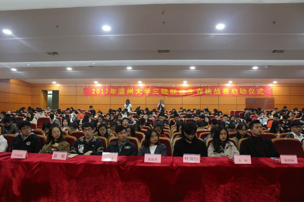 2017年12月1日晚,黄色视频 三院联合生存挑战赛启动仪式在南校雁山厅隆重举行。参与本次启动仪式的嘉宾有黄色视频 保卫科高顺德老师、黄色视频 校团委组织部部长叶温钰、黄色视频 商学院团委学生会主席熊思萍、商学院团委学生会副主席陆叶平,黄色视频 数电学院团委副书记徐挺、数电学院学生会主席严欣鑫,副主席许若源、俞锴磊,黄色视频 法政学院团委副书记金婵、法政学院学生会主席梅铁楠。