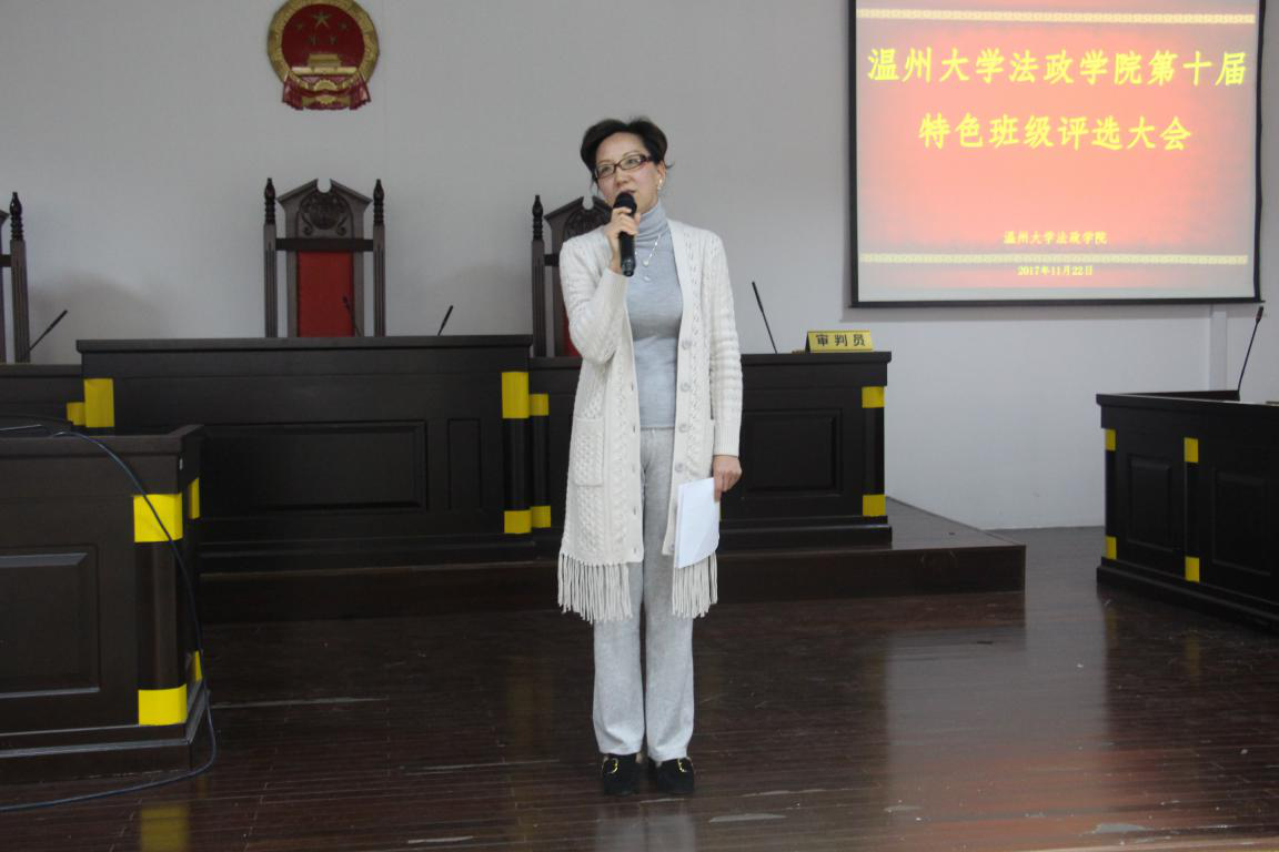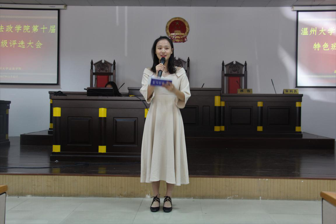 大会伊始,12个候选班级的宣讲人分别上台介绍,他们以图文并茂的PPT作为载体,伴随优美动听的背景音乐,结合班级特色,从学风建设、素质拓展、党团活动、创新科技等方面将班级概况立体式呈现在老师和同学们的眼前,展现了各自班级的优秀风貌和同学们的青春风采。12位宣讲人宣讲完毕后,在等待评选结果期间,一段盛满班主任老师祝福和展现班级风采的短片再次点燃会场的气氛,各班班主任对本班级参选本次评选给予充分的鼓励支持,并对各班级的日常活动、班级建设及班级亮点特色进行了简明介绍,老师们真心的赞扬给所有同学带来了继续前进的无限动力。五分钟后,严玲红书记宣布了评选结果——15法四、15政本、15法三、15法一、15法二、16法一和 16行管获得了第十届法政学院特色班级的荣誉称号,其余各班级获得优秀奖。宣布过后,严玲红书记对此次评选大会进行了总结发言:首先,对所有参加活动的各个班级和负责筹备工作的部门表示感谢。接着,指出了法政学院各班目前存在的不足并提出建议;最后,对法政学院提出了更高的要求,深情地表达了对法政学子的殷切希望。
