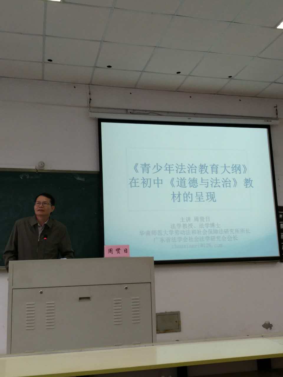 周贤日教授就中学《道德与法治》教材的新变化,以自己的生活实例,生动形象的向大家阐述了培育公民法治意识的必要性,同时也对《道德与法治》教材编写的指导思想、基本内容安排进行了说明。他明确指出,本次初中政治课本改的不仅仅是名字,更是在内容方面做了很大的调整和改变。作为《道德与法治》课的老师,需要认真学习《中华人民共和国宪法》和其他法律法规,需要根据《中共中央关于全面推进依法治国若干重大问题的决定》的总要求,认真学习《青少年法治教育大纲》的阶段目标,明确基础教育阶段学生应初步了解个人成长和参与社会生活必备的基本法律常识。