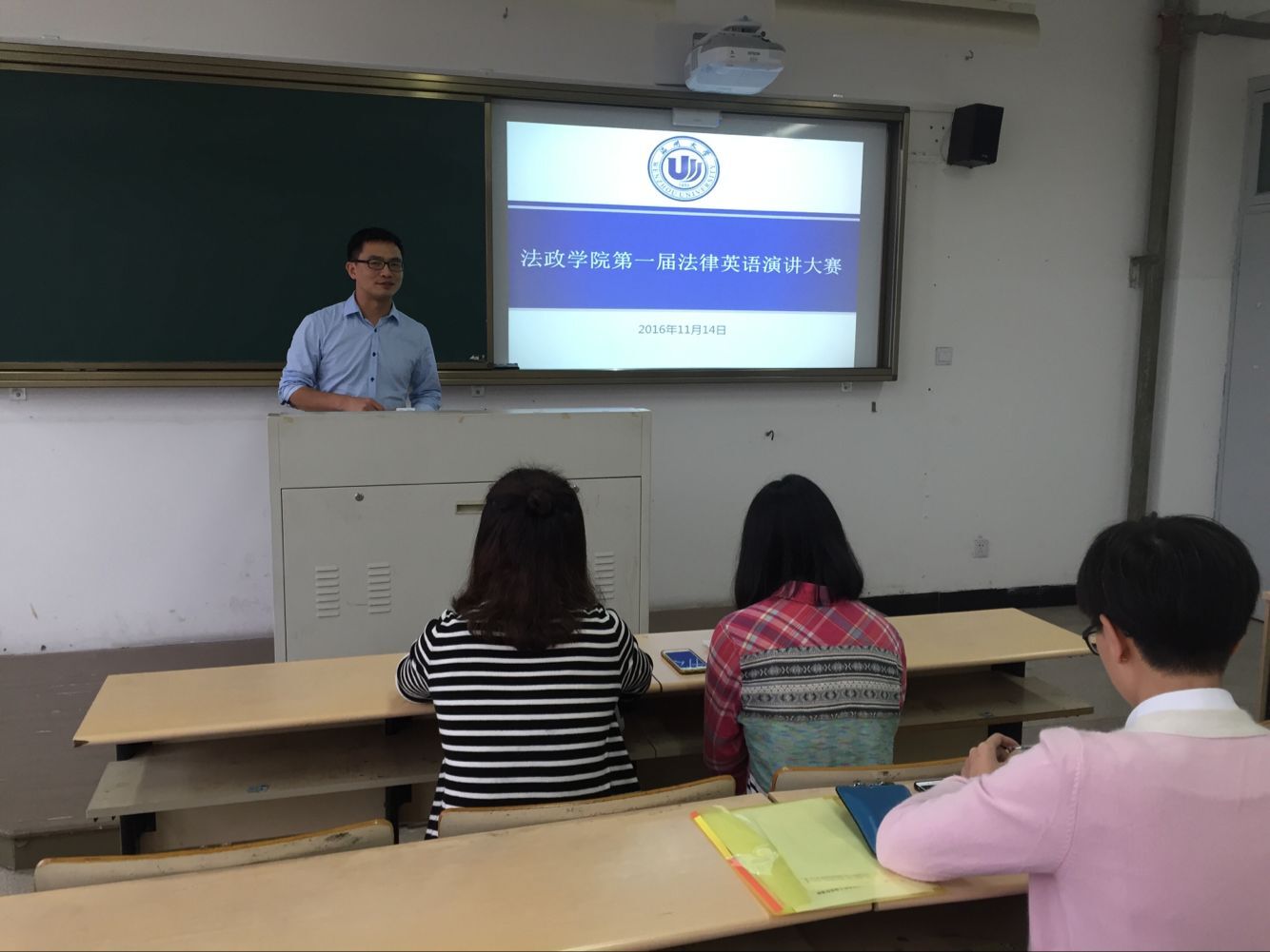 法政学院第一届法律英语大赛之演讲比赛于2016年11月14日在法政楼312教室成功举办。本场比赛由教学科和院学生会学习部联合举办,宗旨为“用英语表达你的法律观点”,目的为提高法政学院学生的英语水平,激发同学们学习法律英语的热情。本次大赛由缪心毫副院长和周一颜老师担任评委。