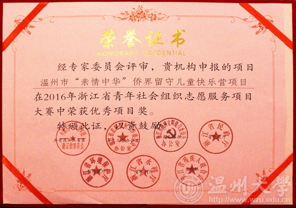 2016年9月8日,2016年浙江省青年社会组织志愿服务项目大赛在杭州举行,来自浙江省各地区、各高校的120个项目参赛,法政学院学生社团的"关爱侨界留守儿童项目"荣获浙江省青年社会组织志愿服务优秀项目奖。